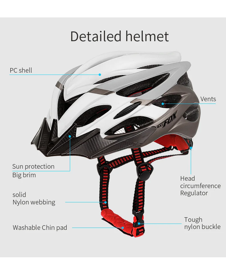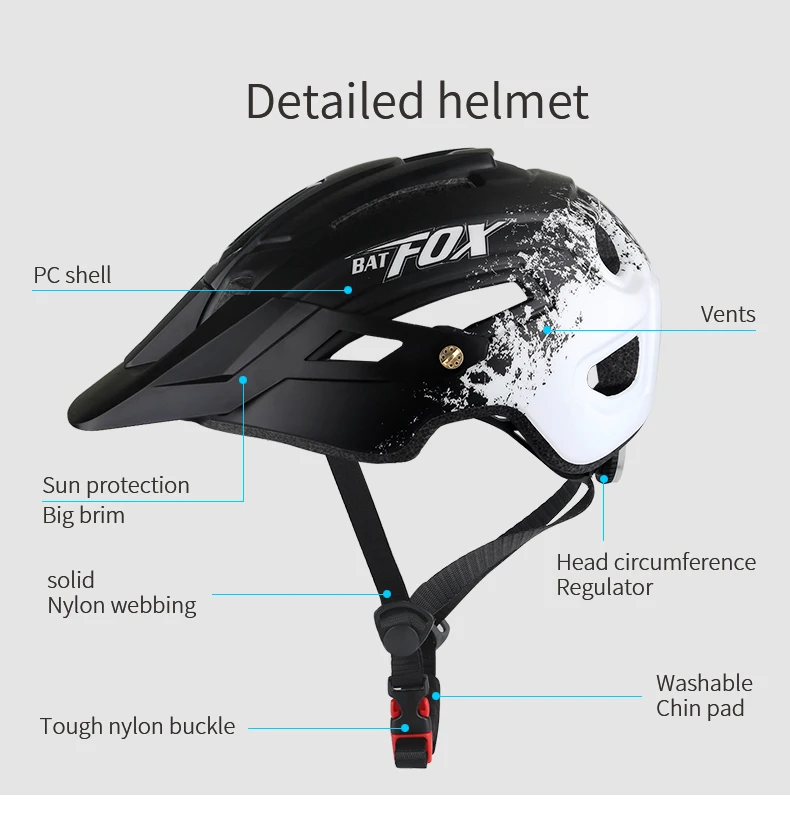 Спецификация:Бренд: BATFOXНазвание продукта: велосипедный шлем1 Размер: 58-61 см регулируется.2 Вес: около 340 г.3 цвета: черный, белый, титаниум, красный, оранжевый, синий, зеленый4 Материал: Поликарбонат + ЭПС + регулируемые поля.5 ДАЛЬНОБОЙНЫЙ Транспорт: внешний прочный корпус из поликарбоната для защиты от ударов и внутренних EPS. Может хорошо поглощать удар.6. Подходит для дорожного велосипеда, для мужчин и женщин.7 он прошел сертификацию CE EN1078.8. Прошел проверку безопасности.9. Пена EPS была утолщена.10. Регулируемый светильник с тремя режимами.Обеспечение большей безопасности для езды на велосипедеВелосипедные шлемы Batfox MTB изготовлены из прочного корпуса ПК и высококачественной пены EPS, обеспечивая большую безопасность Благодаря интегрированной технологии формования.Со съемным козырьком для различных видов деятельности на велосипедеШлем MTB с козырьком подходит для катания на горных велосипедах.И подходит для езды на велосипеде без козырька.С 2 винтами козырек крепится прочно и легко снимается только вручную.