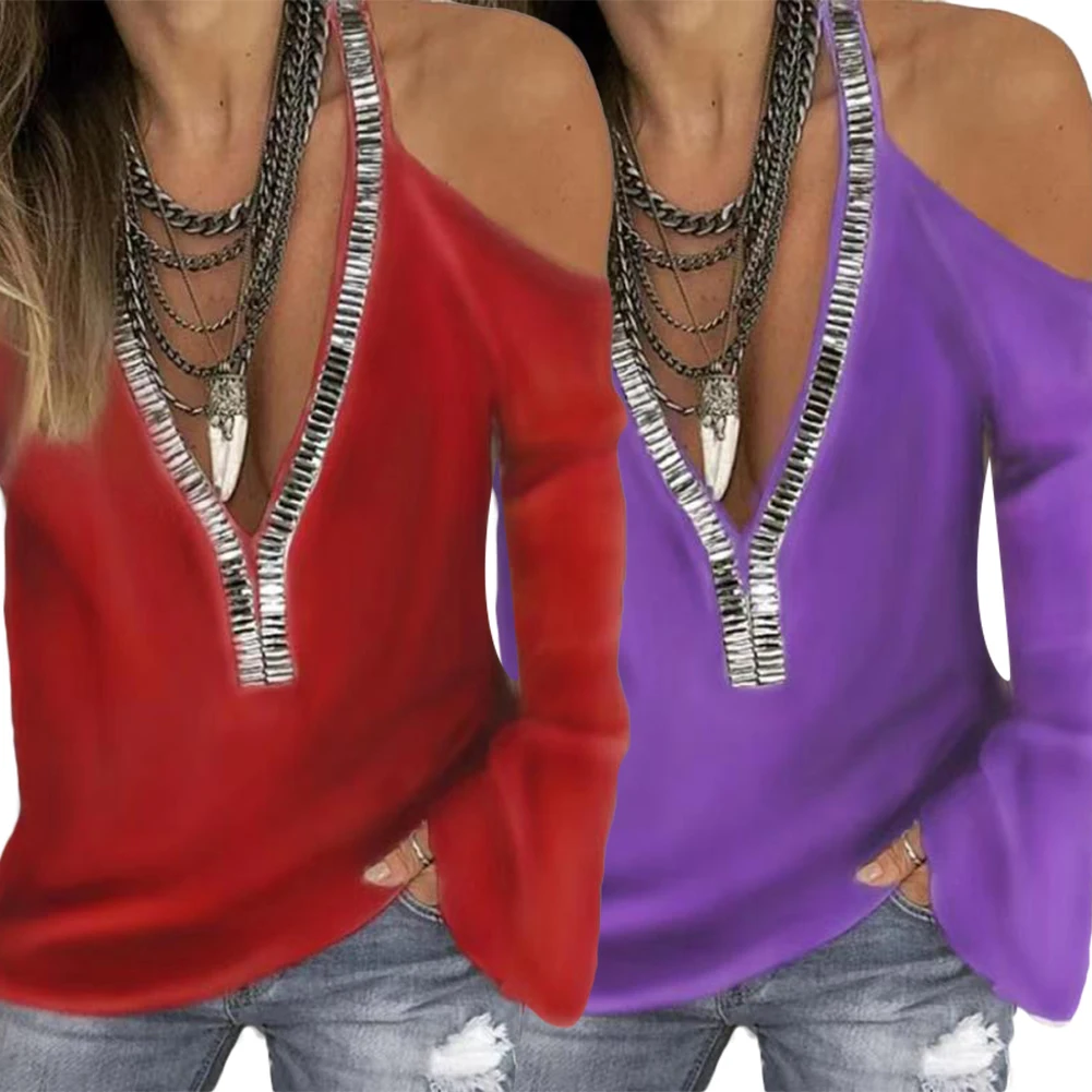 Привлекательная футболка с блестками и V-образным вырезом, футболка с открытыми плечами и длинным рукавом, Женский однотонный топ, женская футболка, женская футболка