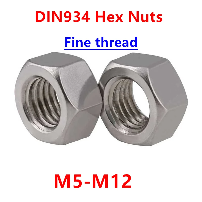 DIN934 тонкая Резьба шестигранные гайки 304 Нержавеющая сталь A2 M5 * 0,5, M6 * 0,75, M8 * 0,751,0, M10 * 1,01,25, M12 * 1,01,251,5