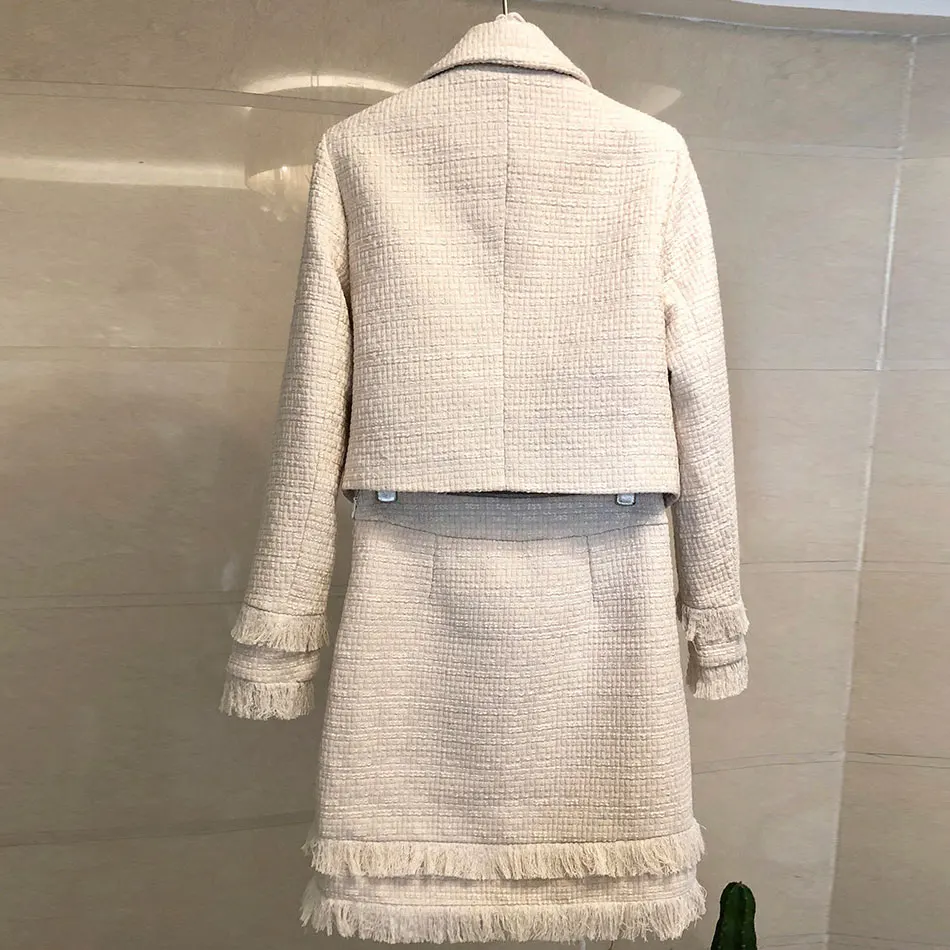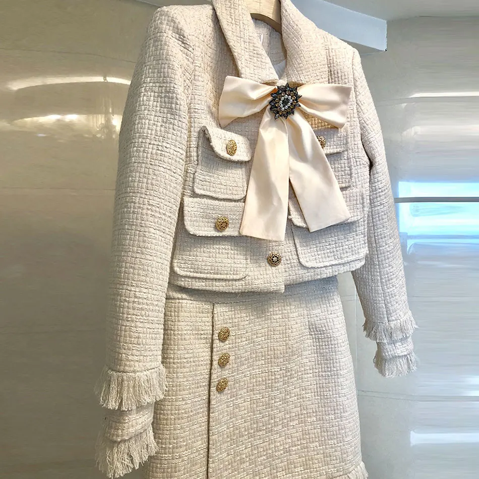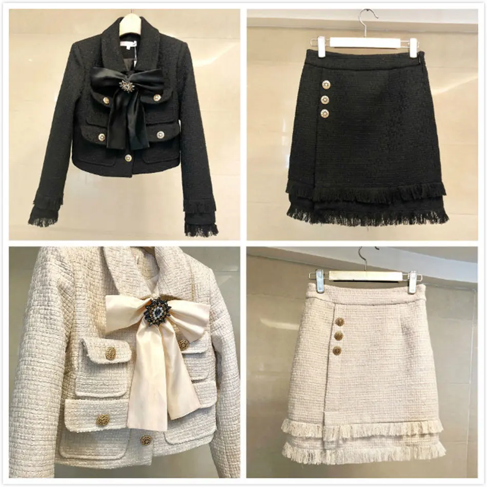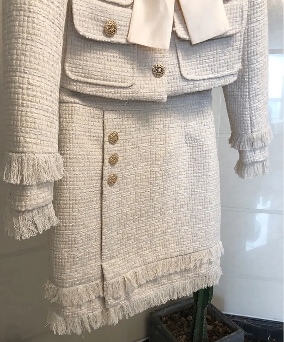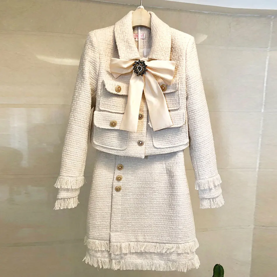 Женский шерстяной подиумный комплект из 2 предметов, роскошный твидовый короткий жакет с бантом и юбка с кисточками, золотистого цвета, зима 2021