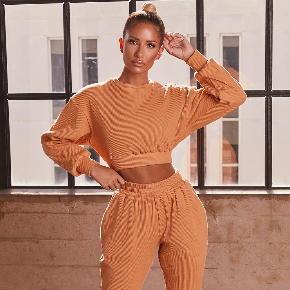 Абрикосовый повседневный комплект из двух предметов, Вязаный топ с карманами, длинные штаны, осенний спортивный костюм, женский комплект, Элегантный Эластичный Женский комплект 2 шт.