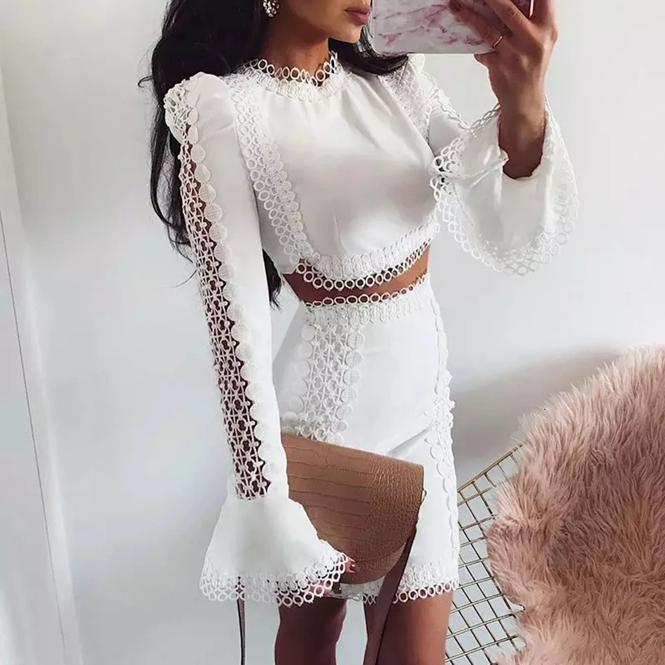 Новинка осени 2021, Кружевной Белый облегающий комплект, сексуальный короткий топ с круглым вырезом и длинными рукавами + мини-юбка вечерние клубный костюм из двух предметов
