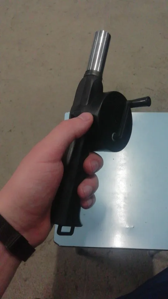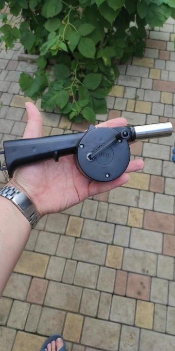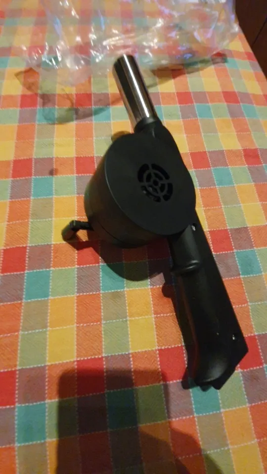 пришло быстро, в сбербанковский постамат. хоть и выглядит смешно, но свою функцию выполняет. изначально издавал странный шум, разобрал, металлических деталей нет (два штифта не в счет) все платстиковое, детали чуть притирались, капнул смазки, собрал, стало веселее. вот реально думал будет слабо дуть, но дует как раз отлично, за счет сопла можно точно дуть на нужные угли. ручка не закреплена, когда крутишь может слетать
