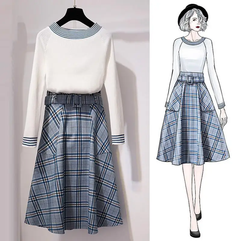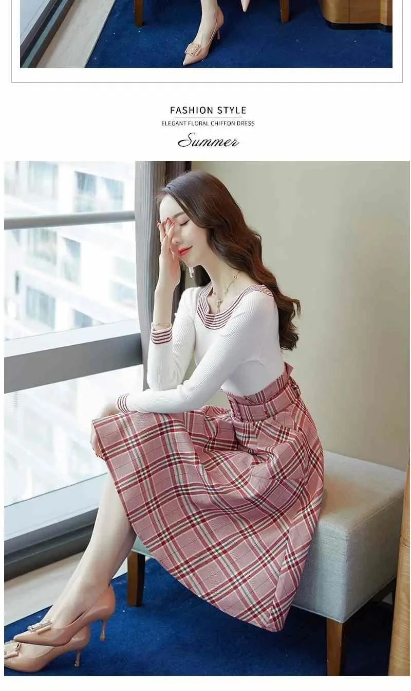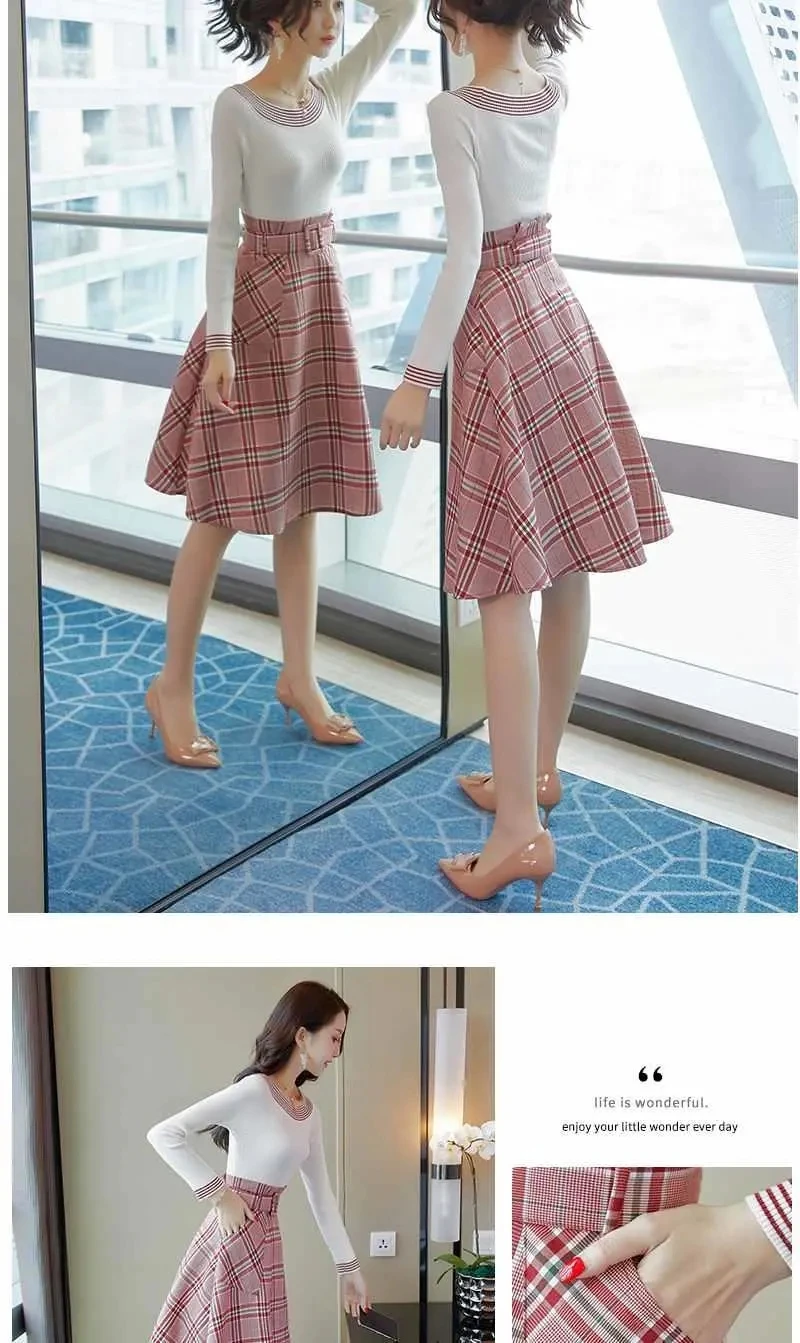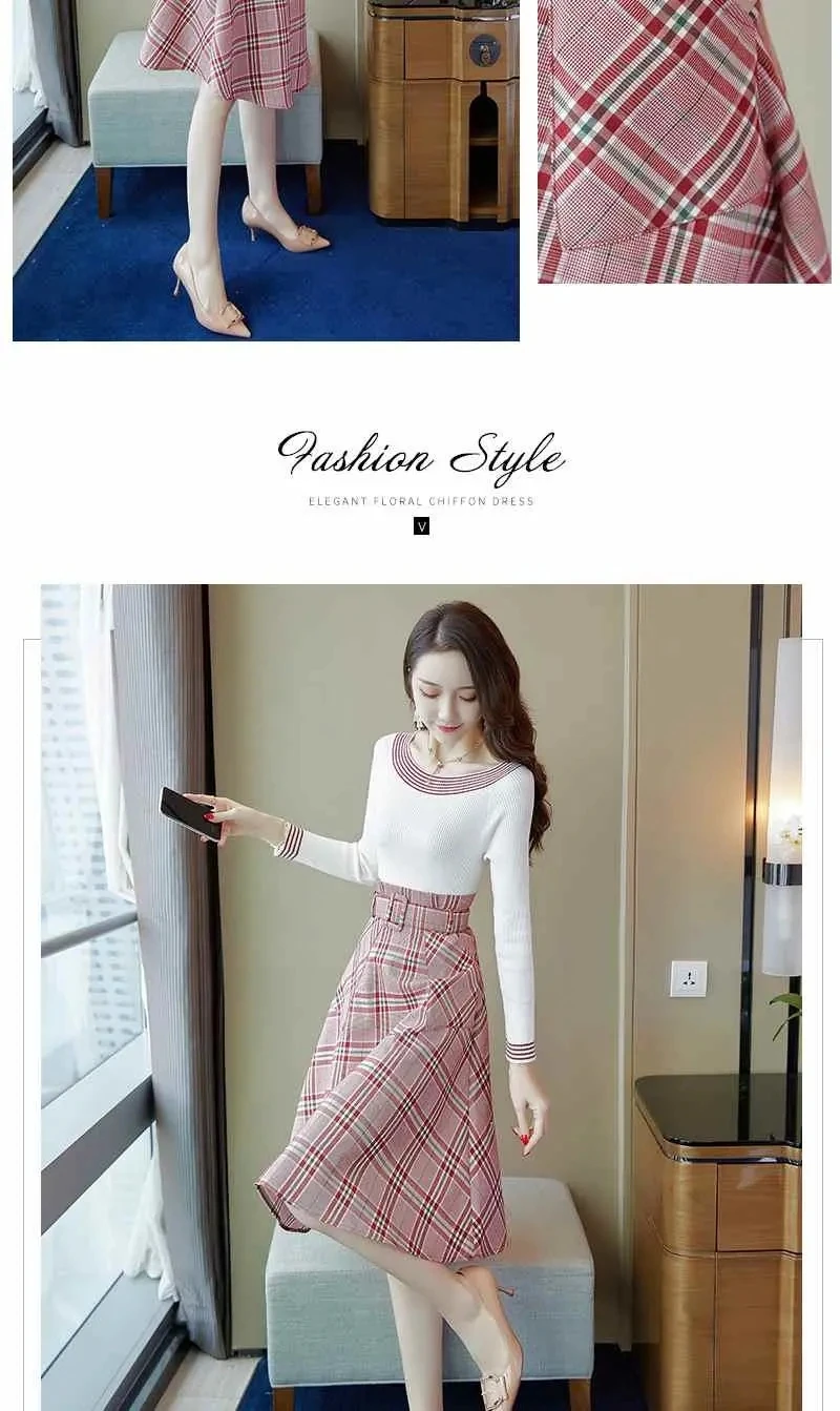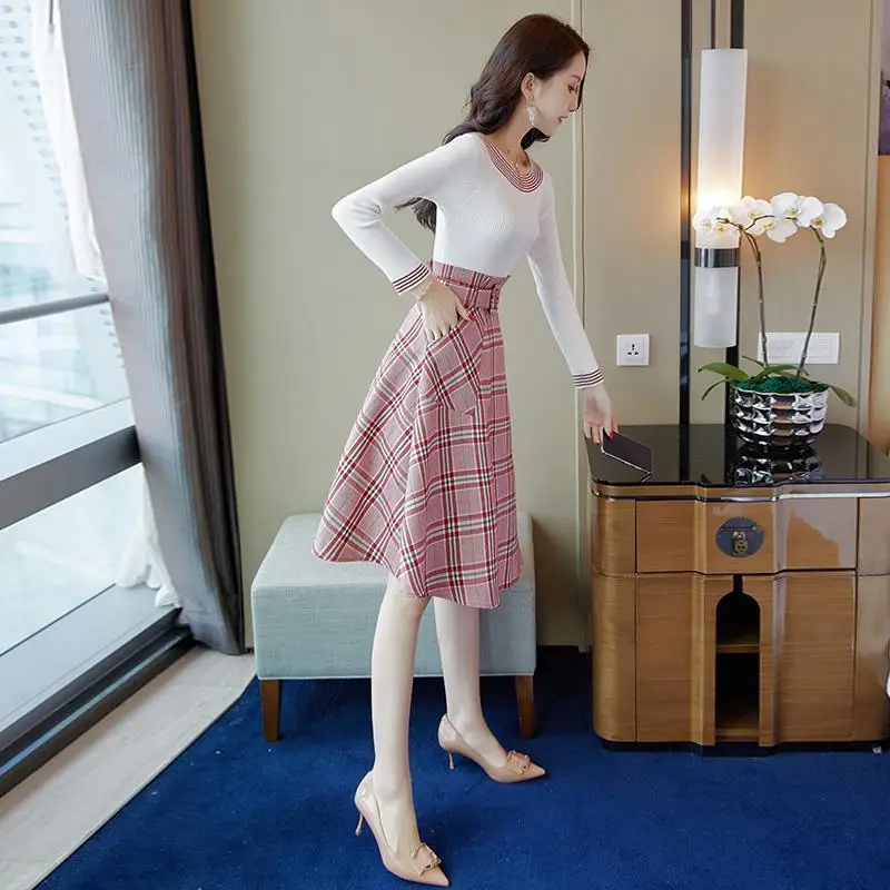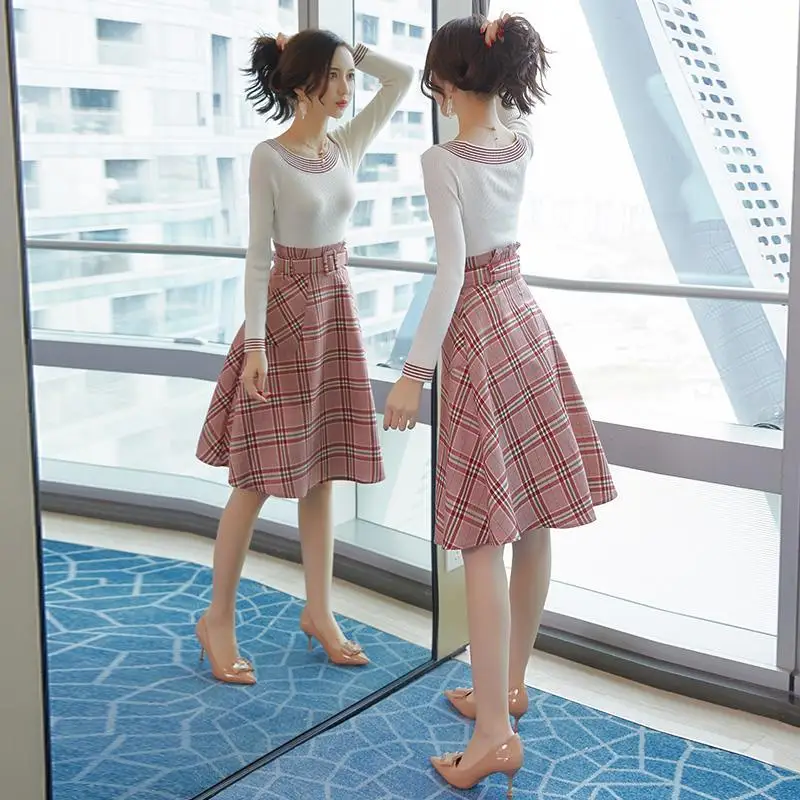 Женский трикотажный костюм, клетчатая юбка А-силуэта и полосатый топ с круглым вырезом, корейский стиль, с поясом и длинным рукавом, весна-осень