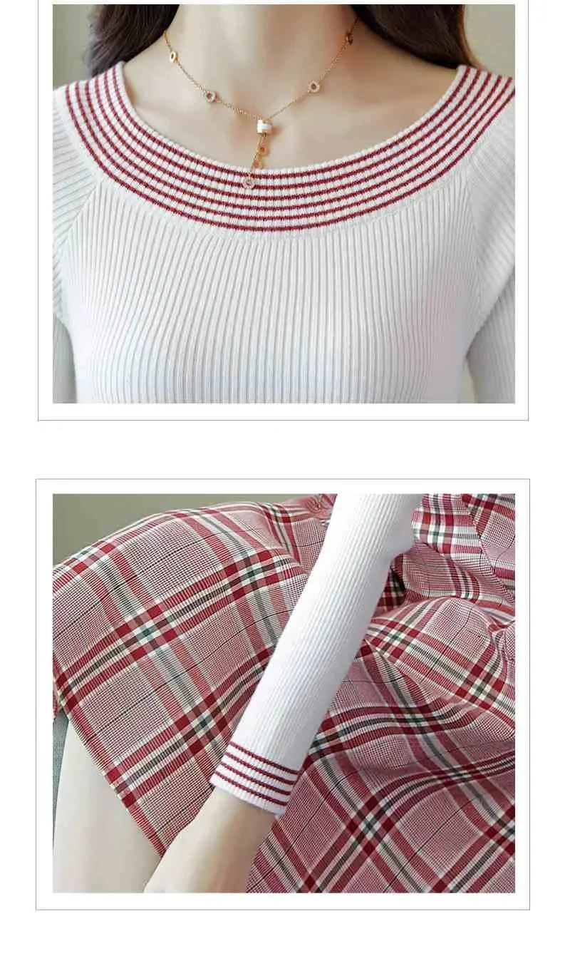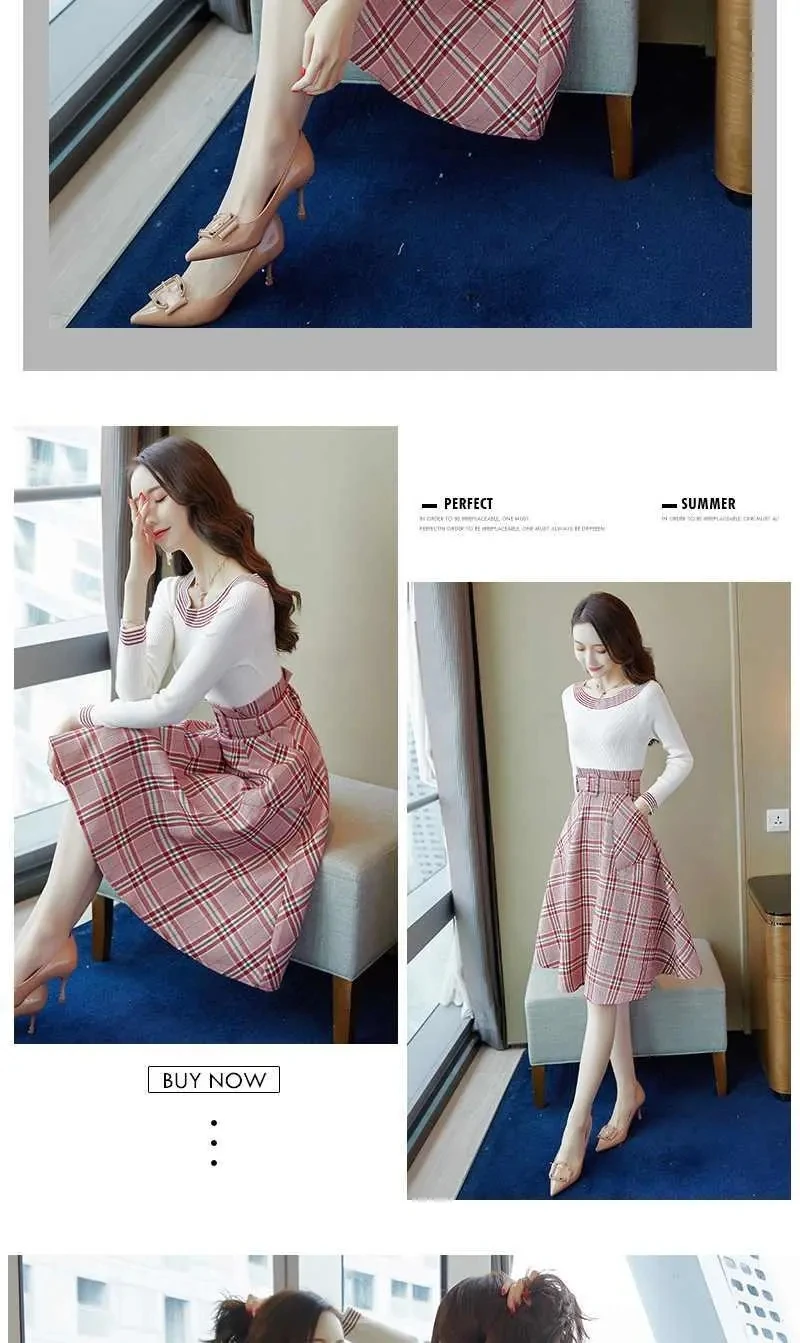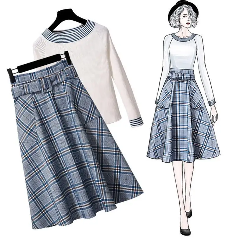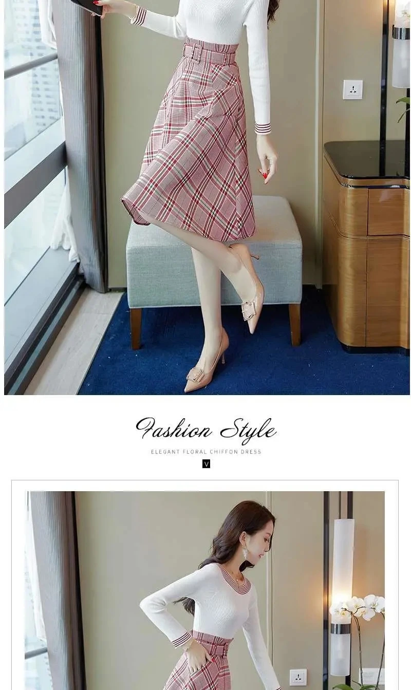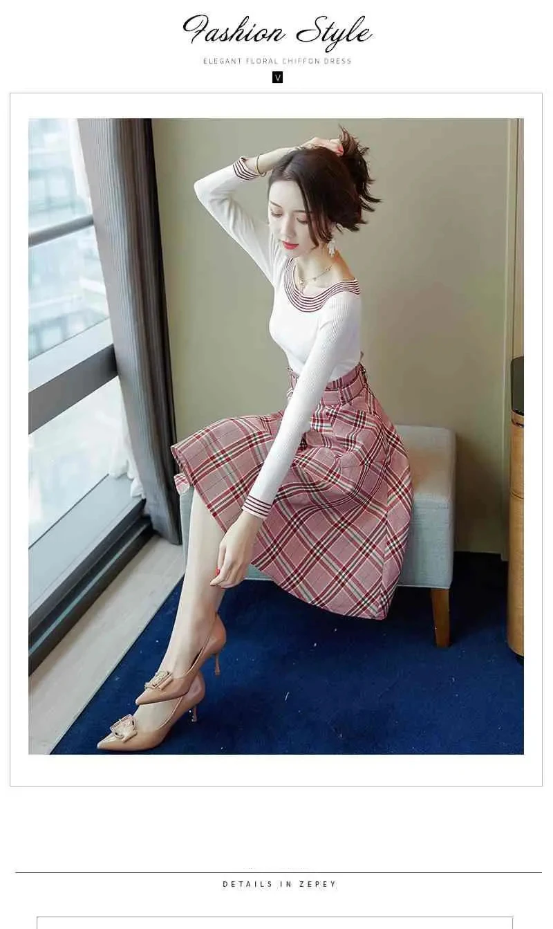 Женский трикотажный костюм, клетчатая юбка А-силуэта и полосатый топ с круглым вырезом, корейский стиль, с поясом и длинным рукавом, весна-осень