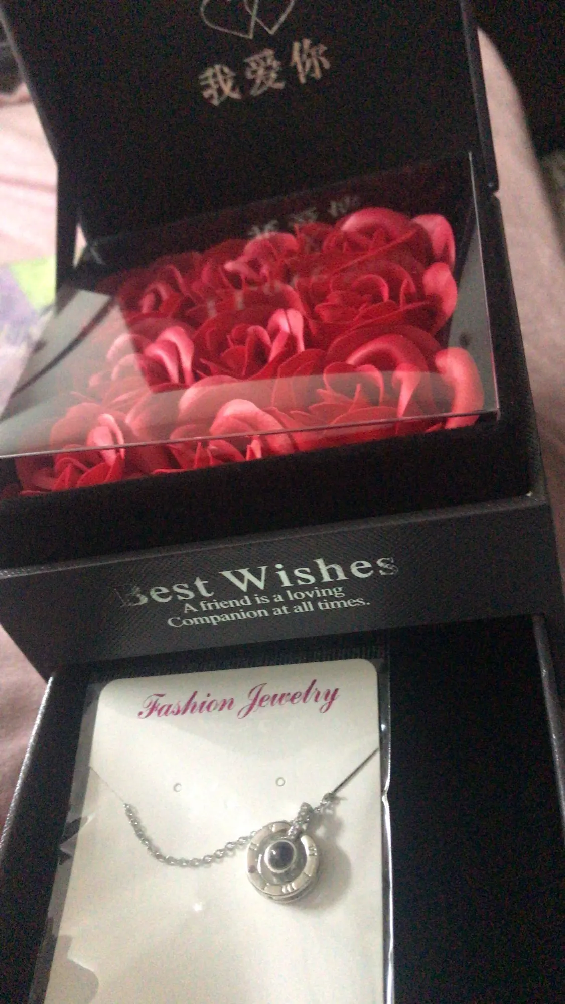 Цепочка- полный провал. Надписи видно очень плохо(размыто) Цепочка состоит из 2 разных по размеру частей, что смотрится не очень красиво Сам кулон по цепочке не перемещается( видимо из-за разного размера звеньев) Ставлю 2 звезды за коробочку с цветочками