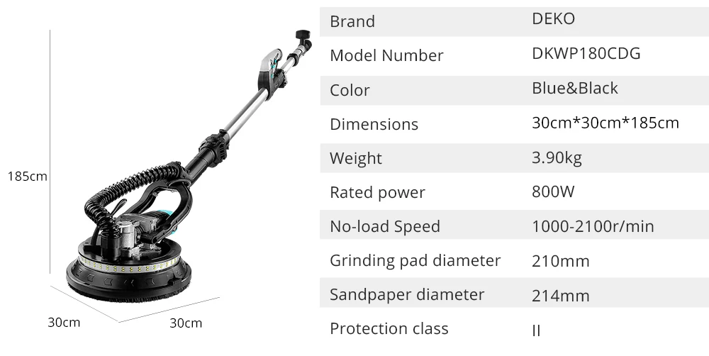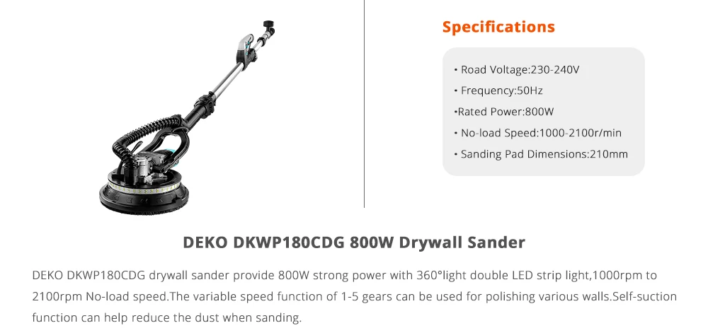 DEKO DKWP180CDG 750 Вт складной выдвижной шлифовальный станок для гипсокартона с наждачной бумагой, светодиодсветильник кой и пылезащитным мешком