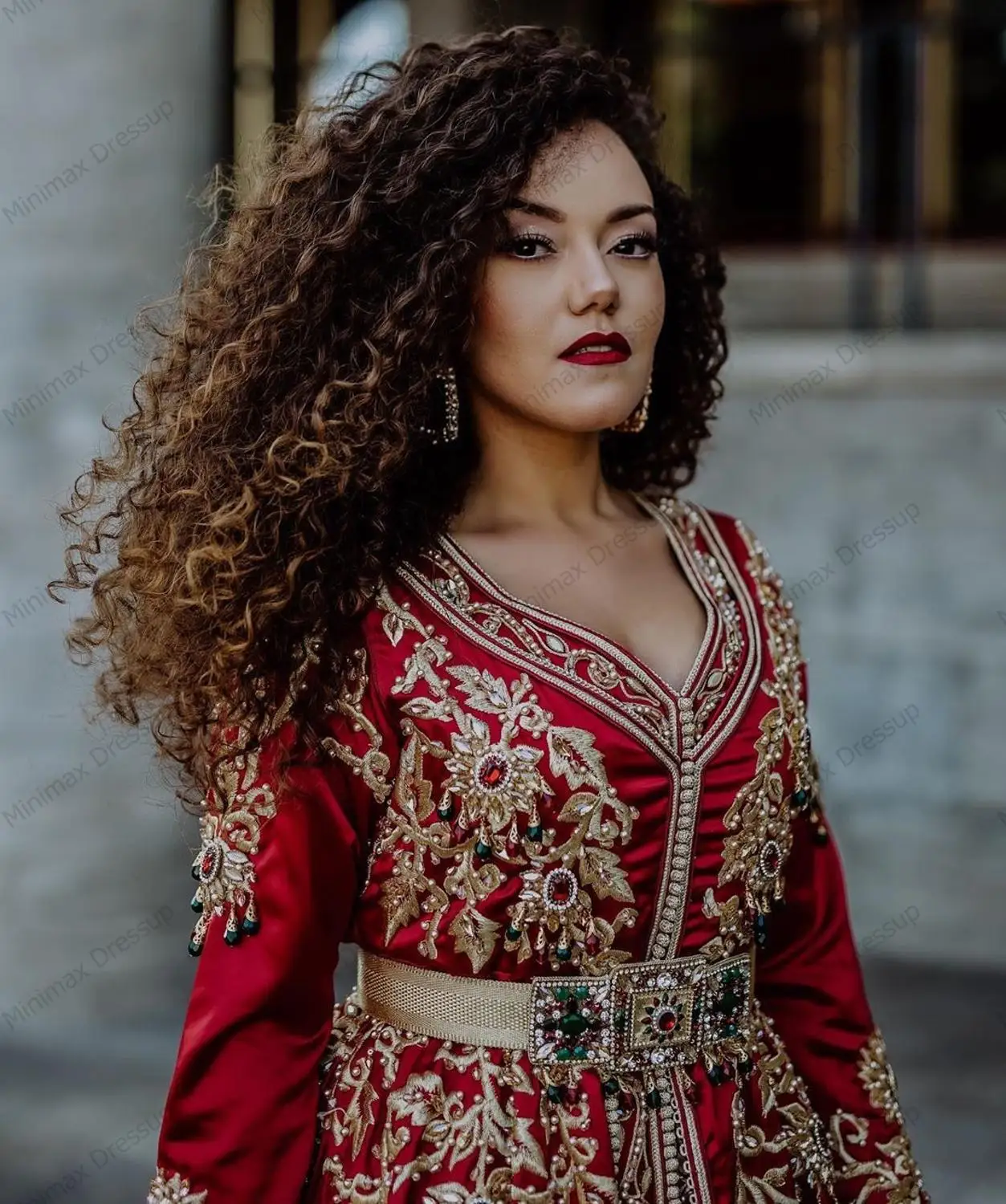 Свадебное платье, Красный марокканский кафтан, свадебное платье для мусульман, с вышивкой, длинными рукавами, кристаллами, арабский, алжирский, на заказ