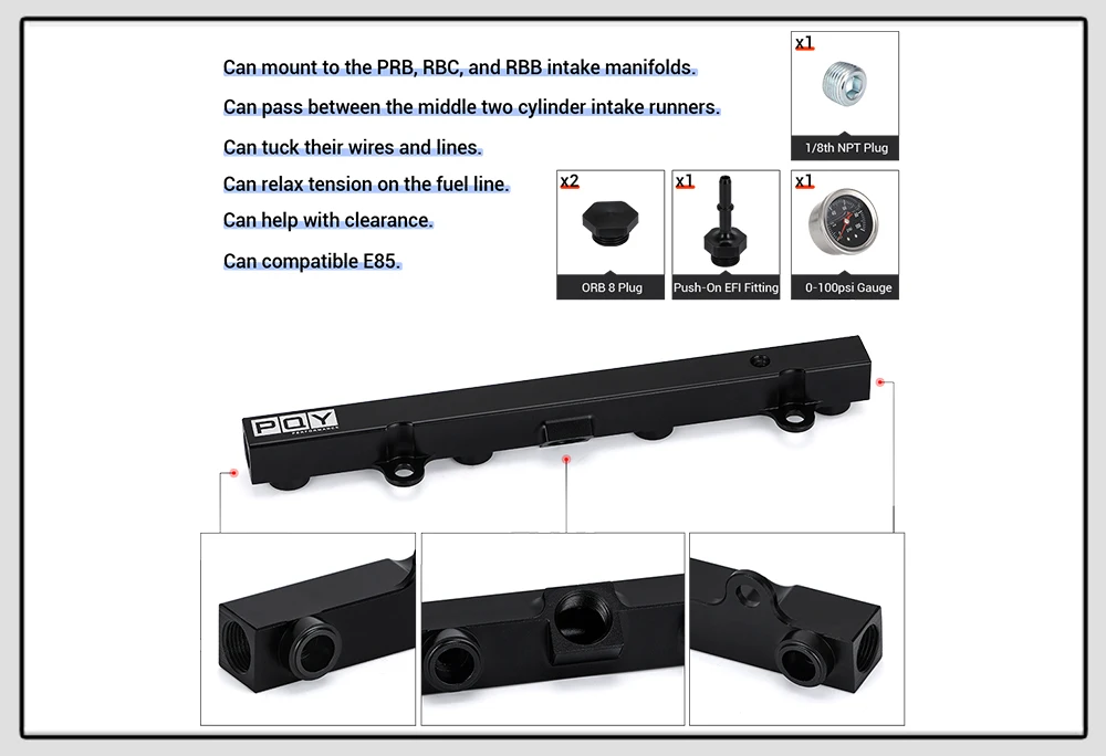 100% гарантия качества протестирована, более отзывчива, дешевле, проще в установке.Рельс включает в себя отверстие 1/8 "NPT, которое позволяет установить датчик давления топлива непосредственно на топливную рейку. Это помещает датчик давления топлива в место, которое легко видно, так что вам не нужно тыкать в отсек двигателя просто, чтобы увидеть, есть ли у вас давление топлива.Все порты могут принять a -8 ORB фитинг на входе (ы) и выходе позволяет запускать либо-6 или-8 топливных линий.Это расположено так, что топливная линия может проходить между средними двумя цилиндрами впускных полос (в зависимости от впускного коллектора). Это отличный вариант для тех, кто хочет подвернуть свои провода и линии.Рельс был показан для установки на впускные коллекторы PRB, RBC и RBB без каких-либо изменений. Любые впускные коллекторы, которые имеют одинаковые точки крепления топливных рельсов, как PRB, RBC или RBB, также должны принять этот рельс.Если у вас есть 02-05 Civic Si или 02-06 RSX, нажимной топливный фитинг для вас. Монтируется на конце топливной магистрали, эта часть поставляется с топливной магистралью. Он оснащен расширенным фитингом, чтобы расслабить напряжение на топливной линии и помочь с очисткой. Поставляется с уплотнительным кольцом для предотвращения протечек с совместимым E85.Материал и цвет: