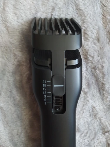 Имеет расческу для позиционирования слайдера, которая фиксирует Длину стрижки от 3 до 21 мм и поддерживает регулировку одной кнопкой для удобства эксплуатации