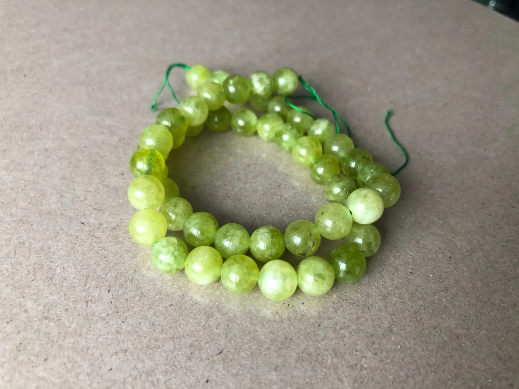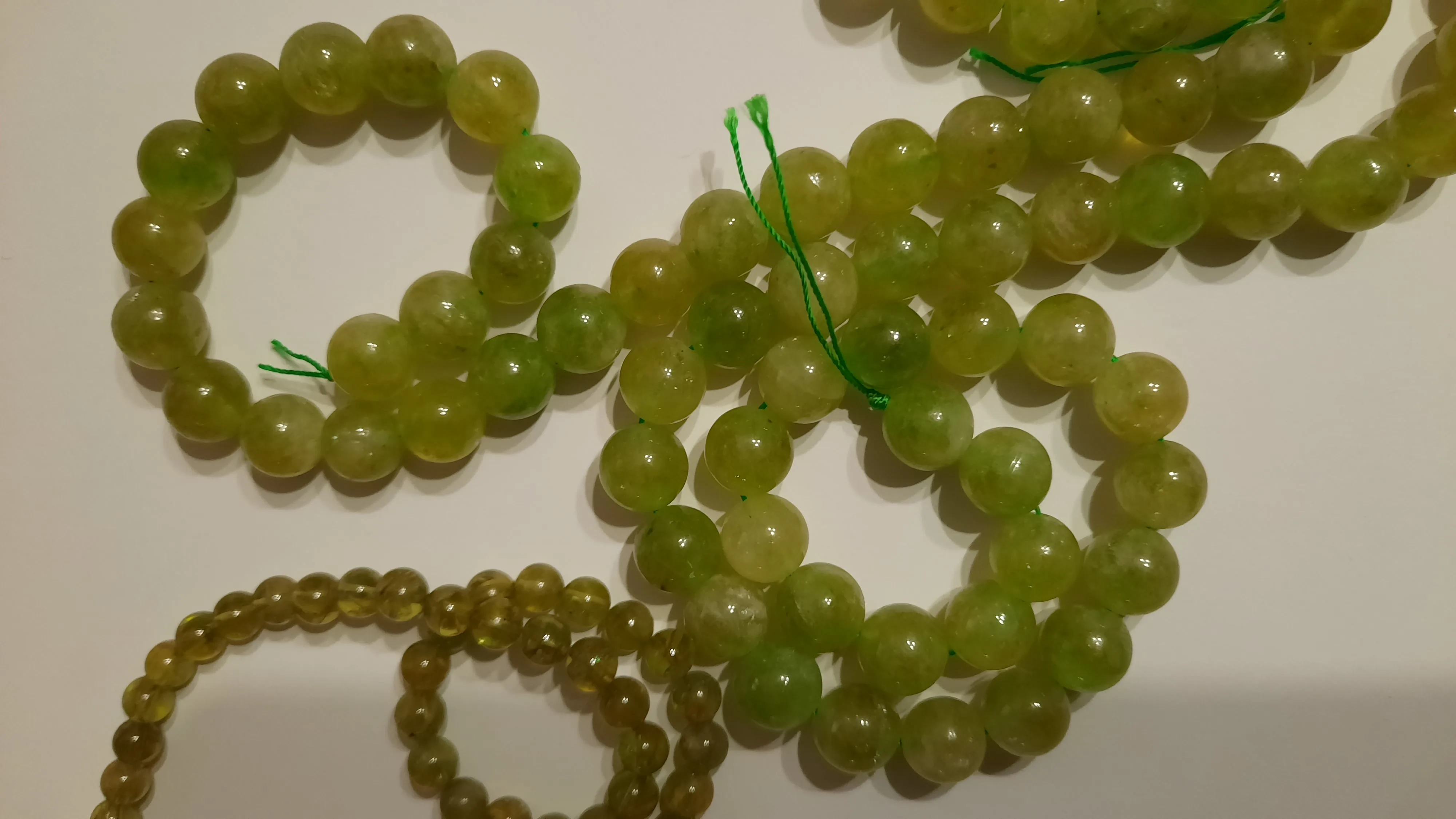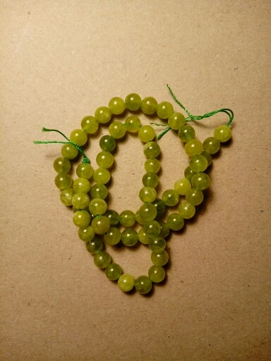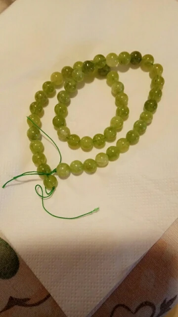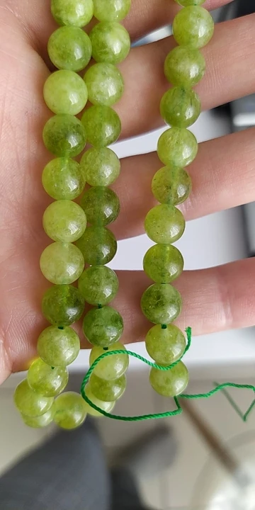 Доставка три недели. Бусины немного отличаются от фото, светлее, все непрозрачные, с молочным оттенком. Но мне даже больше понравились. На нитке 39 шт. Сомневаюсь очень, что это перидот, больше похож на тонированный халцедон. Отшлифованы хорошо, сколов нет.