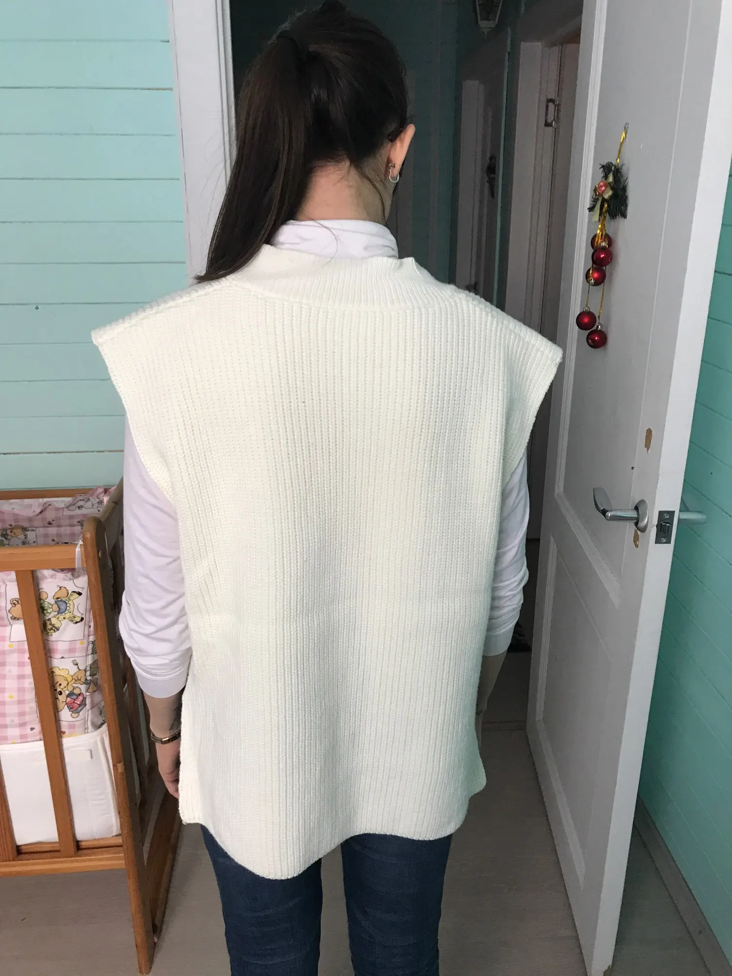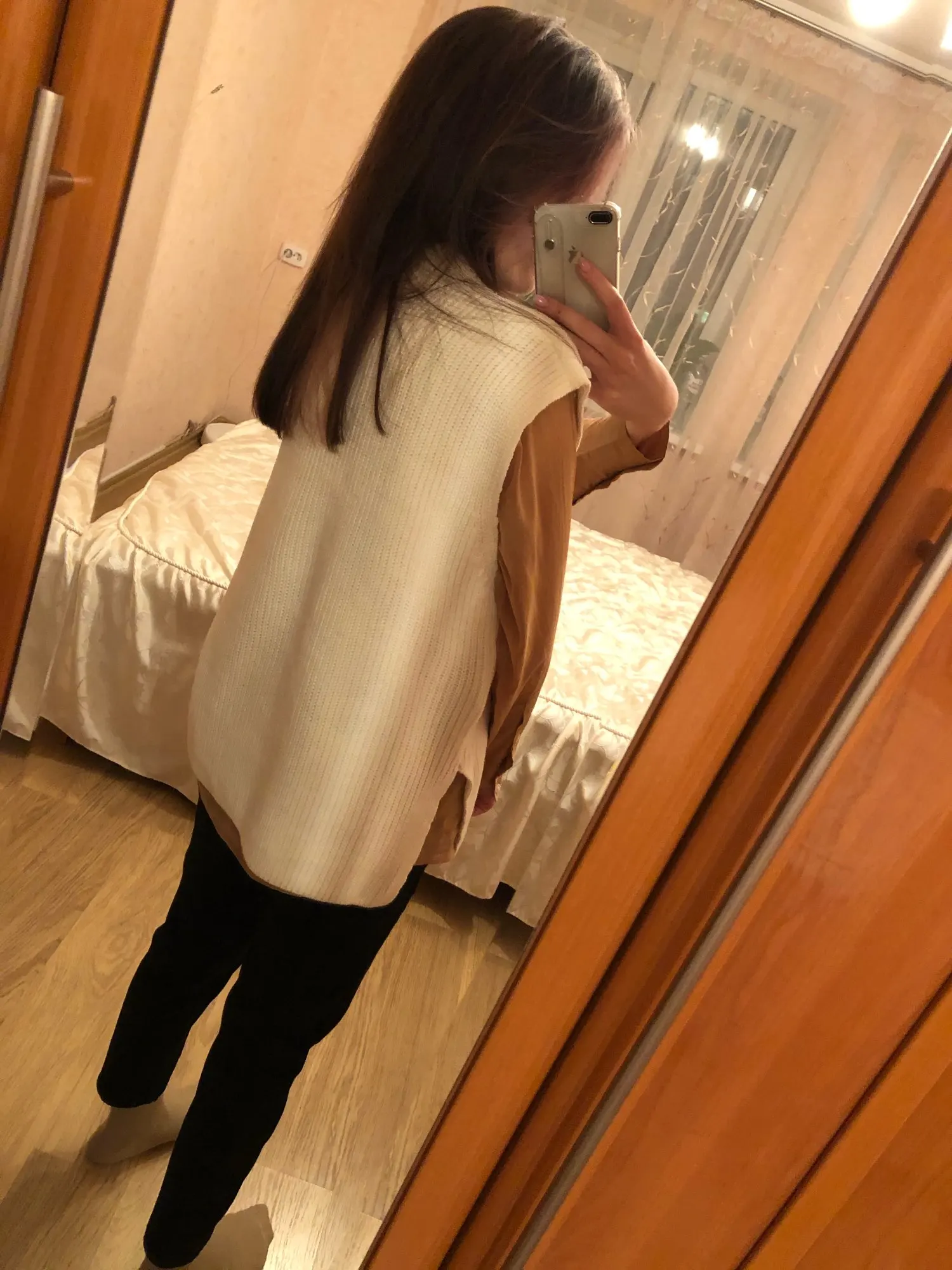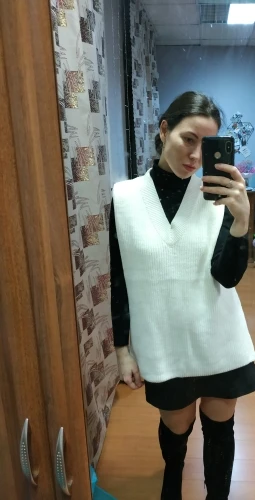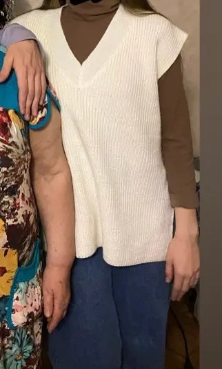 Это очень классный свитер-жилет. Очень мягкий, теплый, и в любом месте ничего не колется. Все швы обработаны качественно. Рост 165 см и вес 56 кг, мои параметры 92-79-100, я заказываю M. Товар пришел менее трех недель. Выглядит потрясающе, мне это уже нравится!