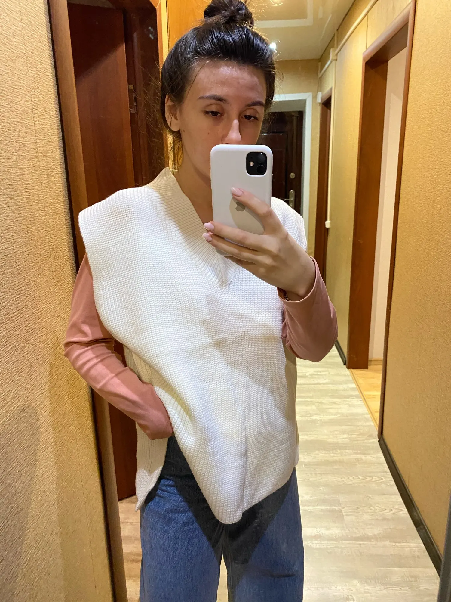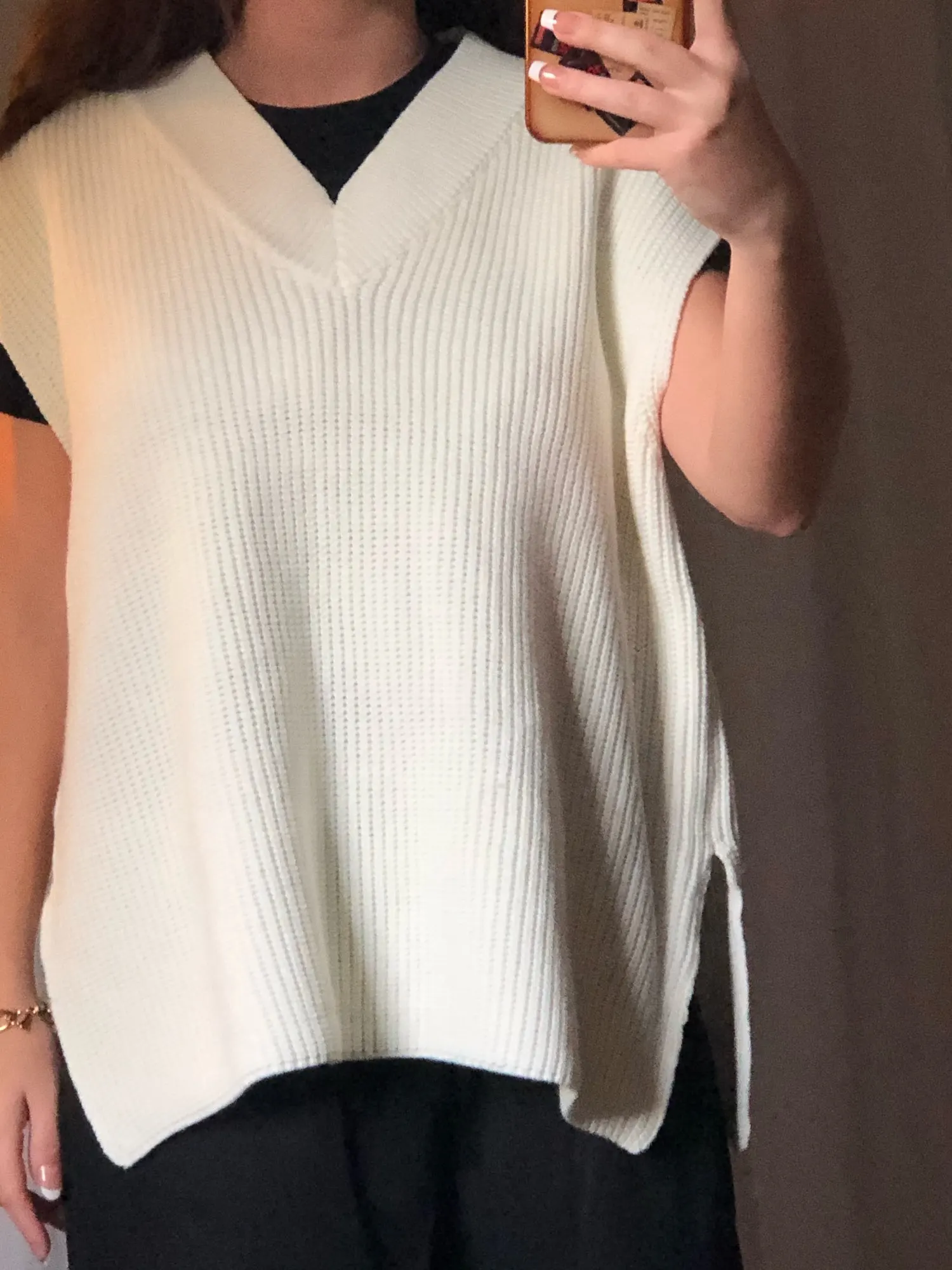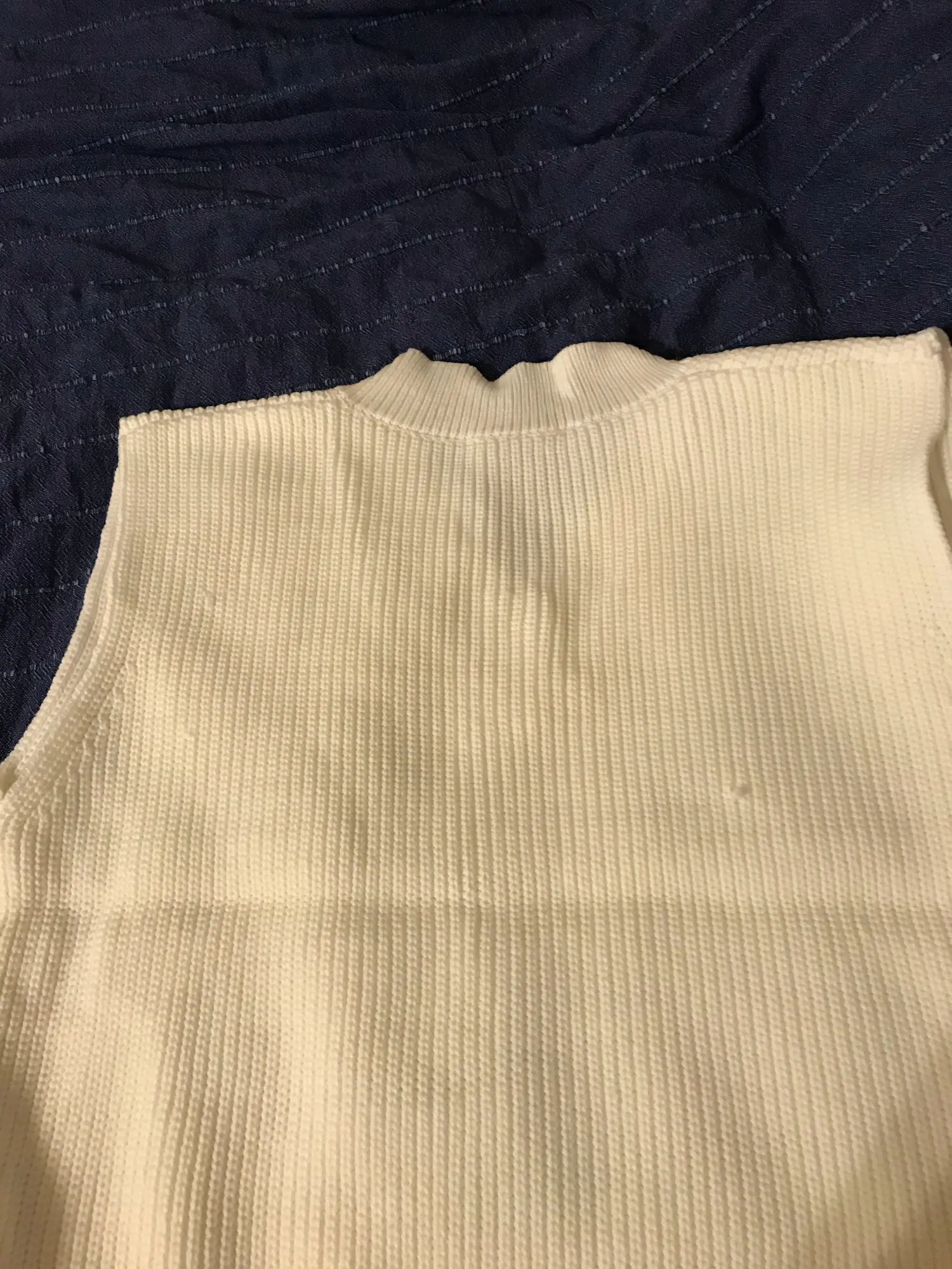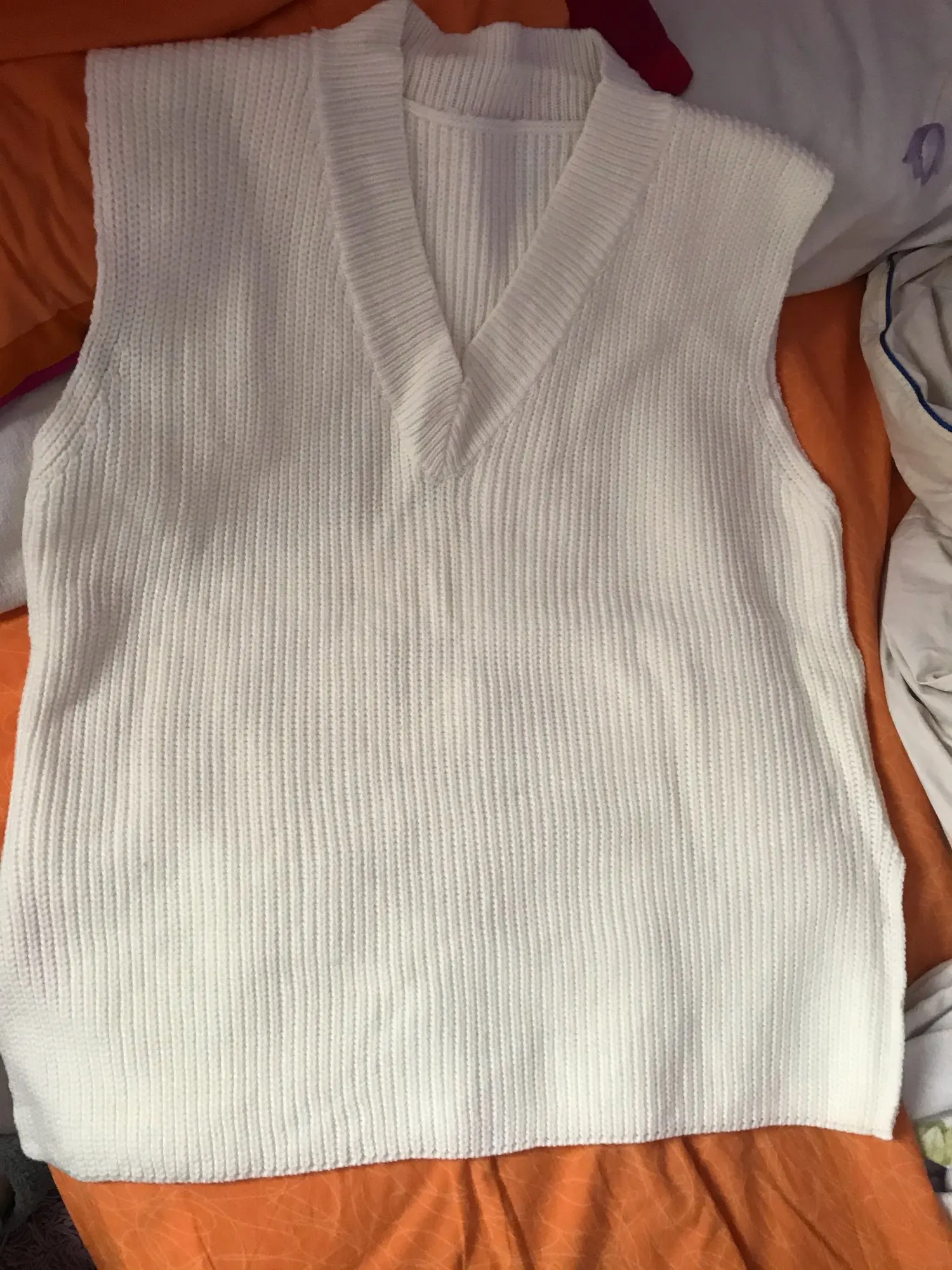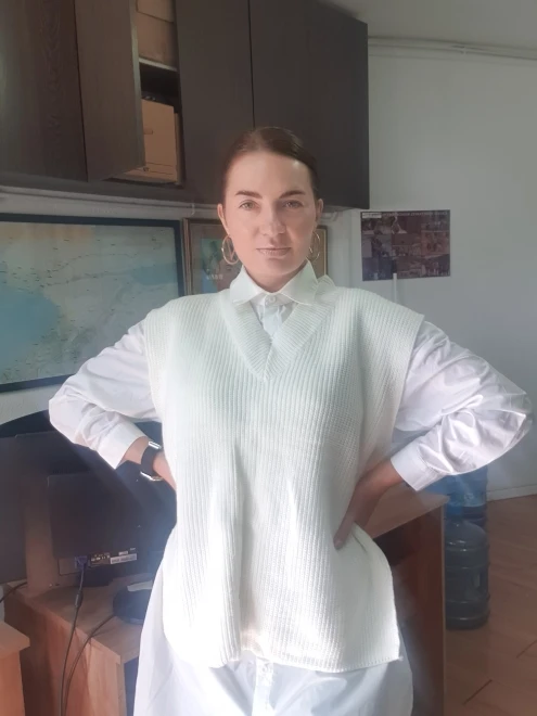 Заказ пришёл за месяц. Безрукавка классная, фязка фабричная, плотная. Ниток не было, но был запах деревянного дома, как будто она пролежала в нем пол года)) Цвет не белые, а с желтизной (а-ля айвори). На рост 168 и вес 57 взяла S и не пожалела. Не очень нравится что она широкая и проемы для рук тоже большие, уж лучше ширь заменили бы на длину... И я не очень люблю разрезы, но за такую цену я довольна покупкой!