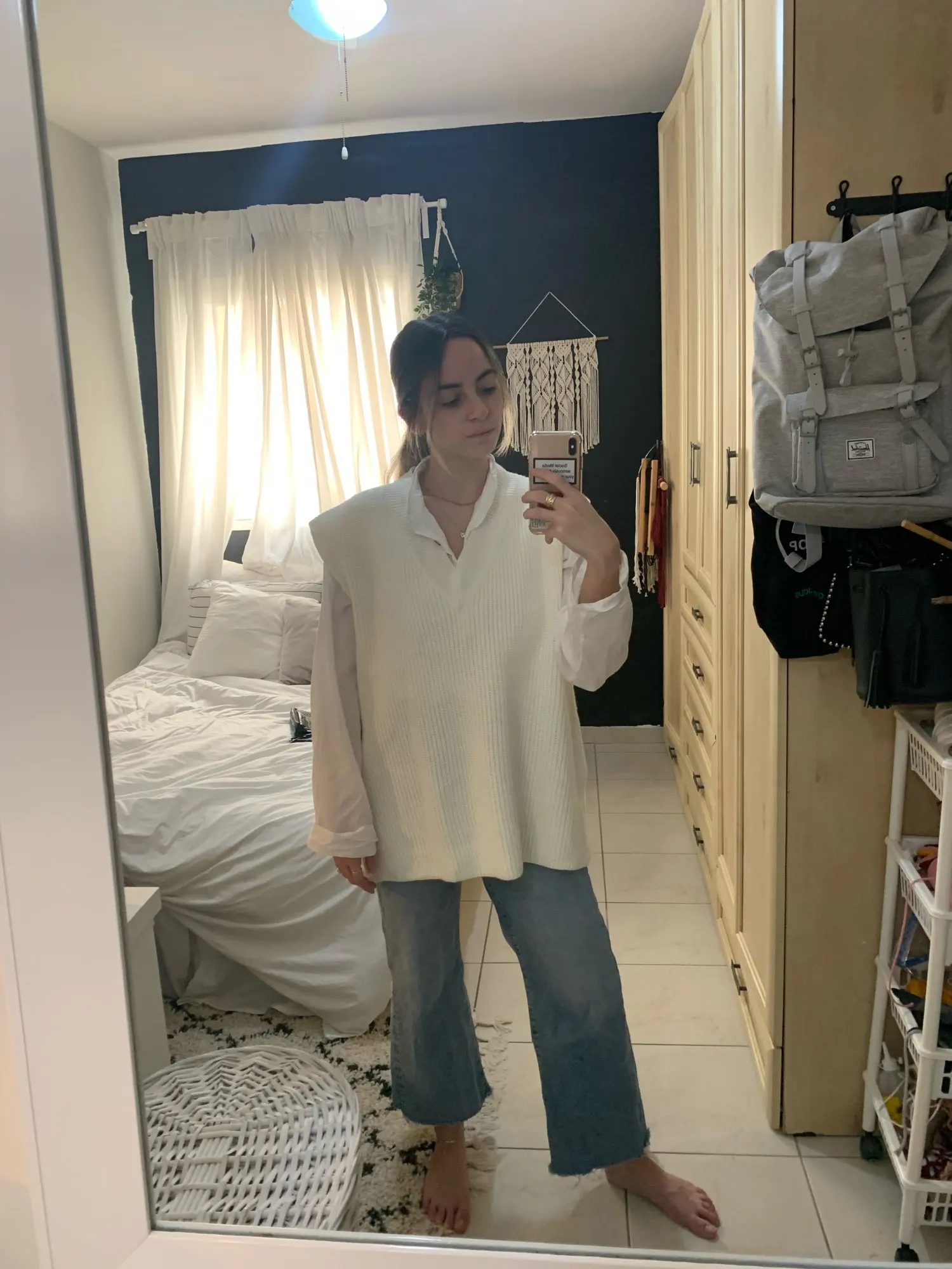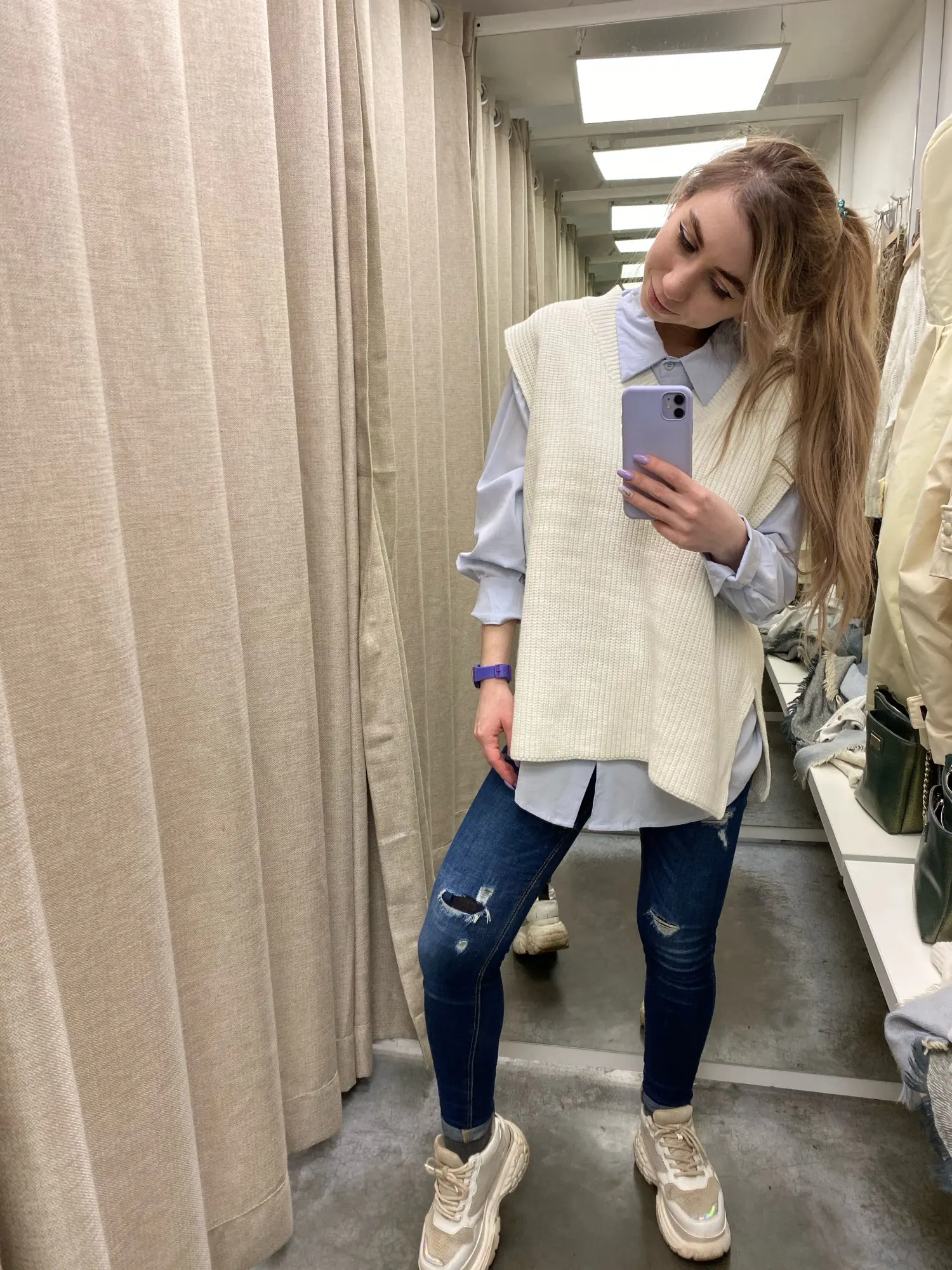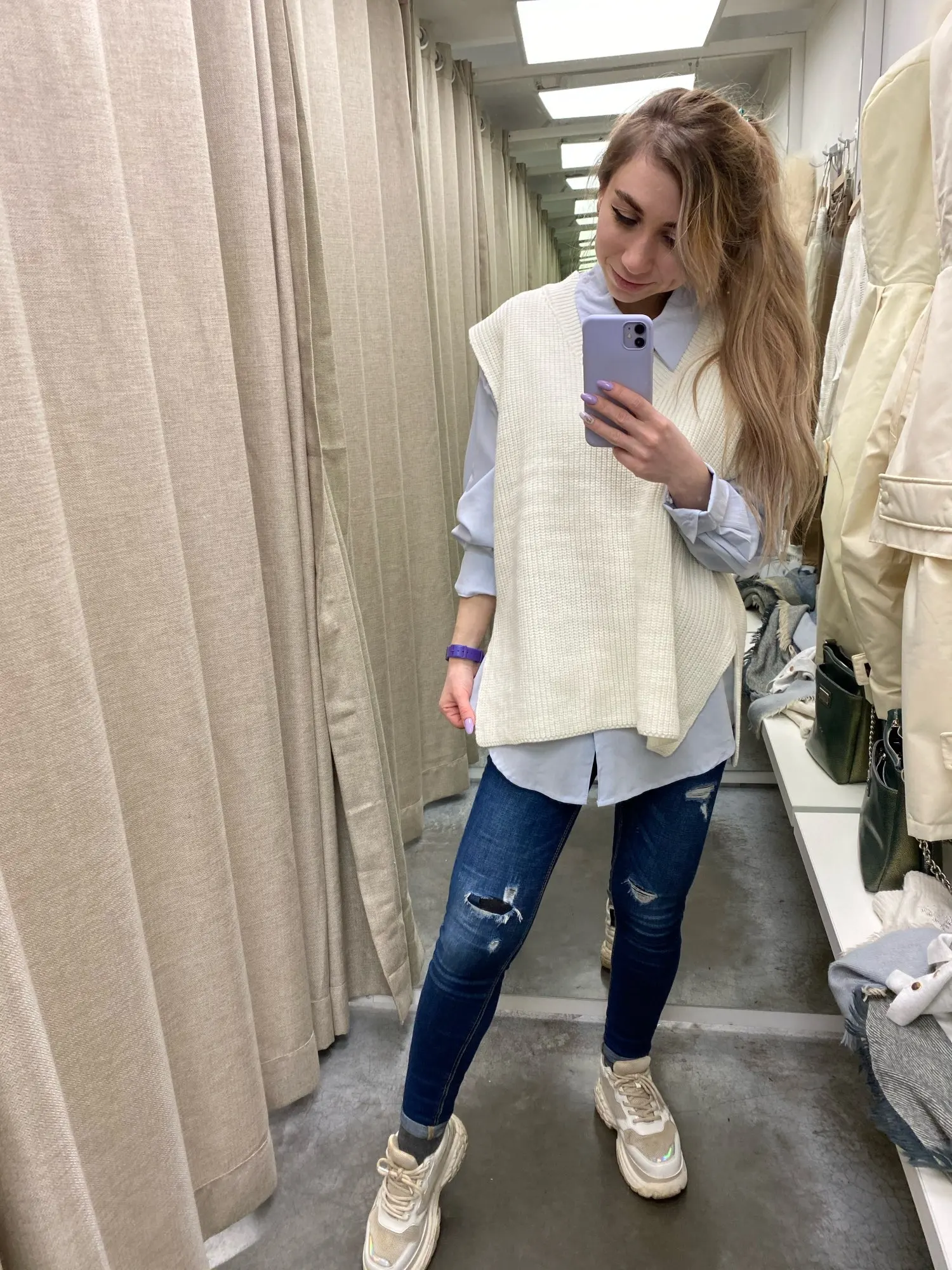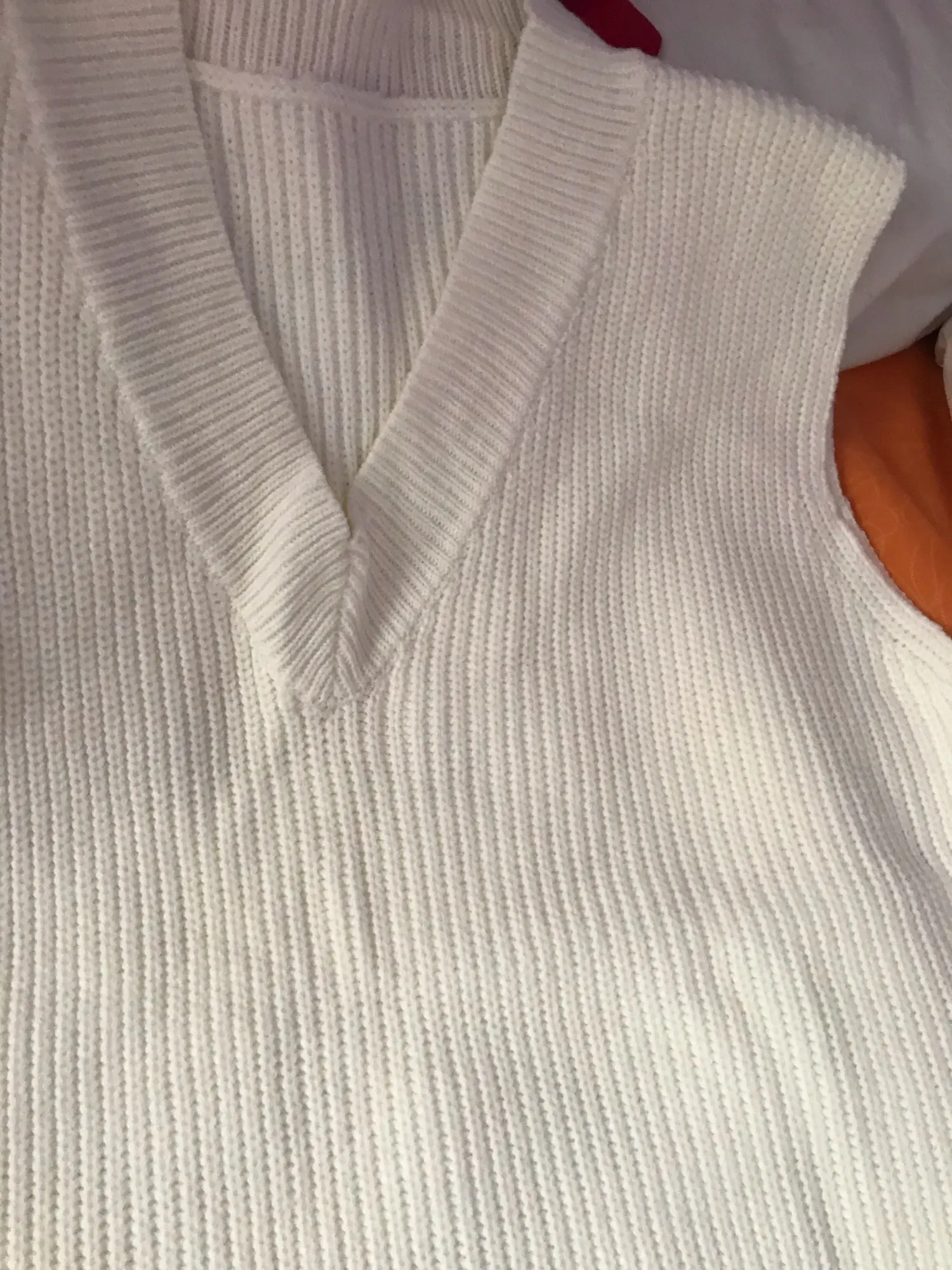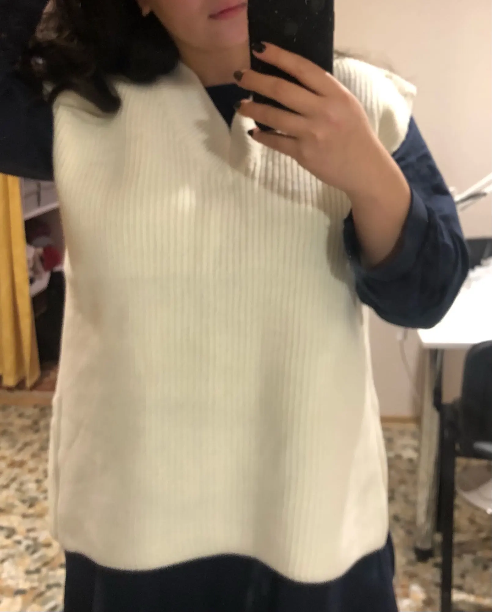 Заказ пришёл за месяц. Безрукавка классная, фязка фабричная, плотная. Ниток не было, но был запах деревянного дома, как будто она пролежала в нем пол года)) Цвет не белые, а с желтизной (а-ля айвори). На рост 168 и вес 57 взяла S и не пожалела. Не очень нравится что она широкая и проемы для рук тоже большие, уж лучше ширь заменили бы на длину... И я не очень люблю разрезы, но за такую цену я довольна покупкой!