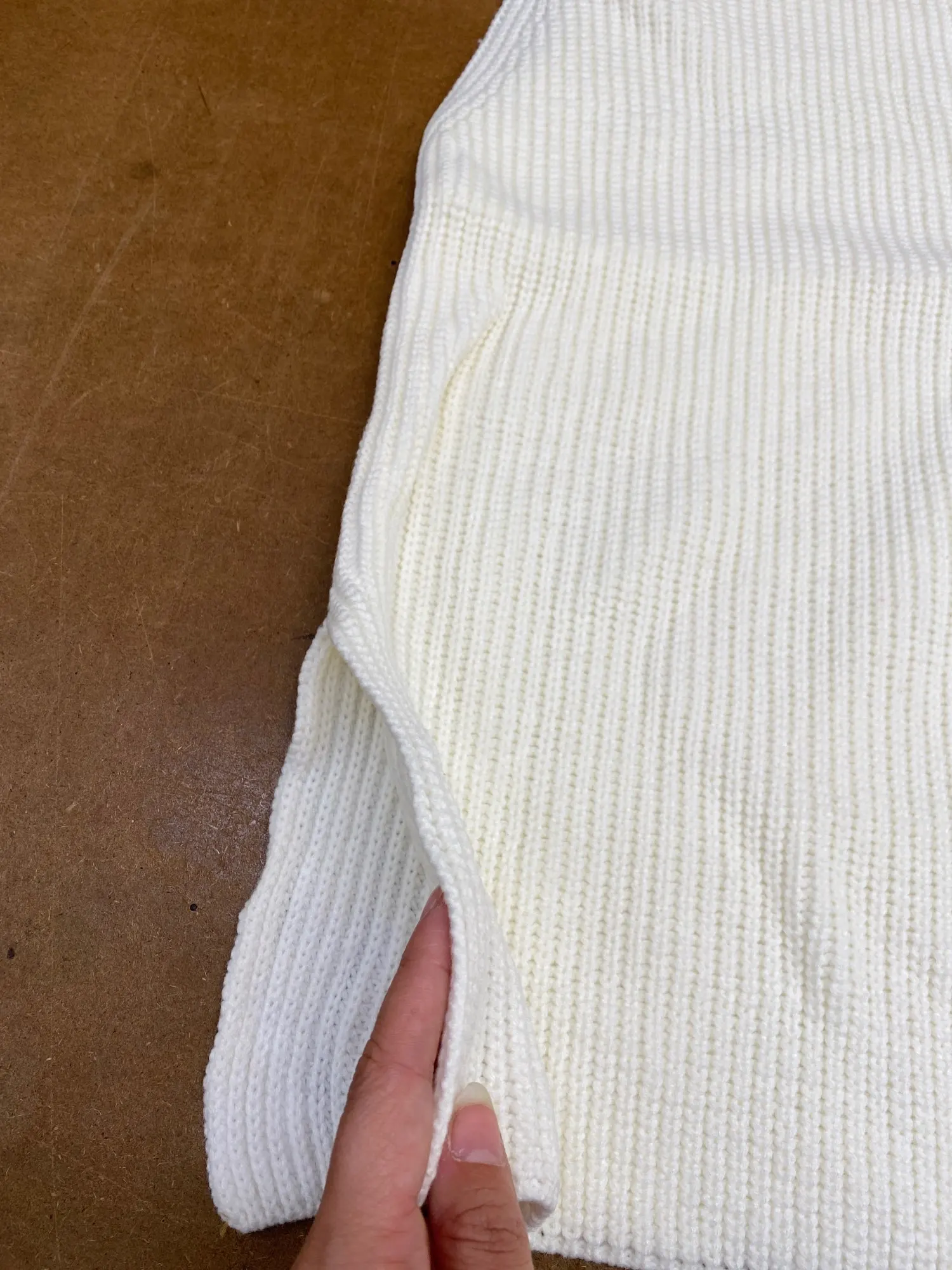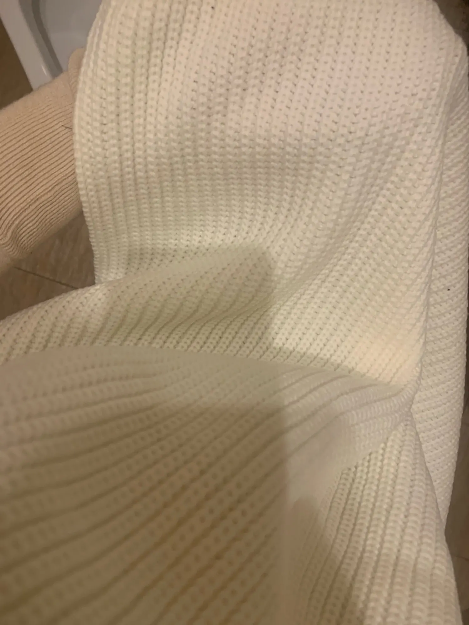 Цвет не белый, с желтизной, на мой 46-48 размер сел примерно как на модели, но короче. Широкий крой, плотная вязка. Доставка быстрая, с продавцом не общалась.