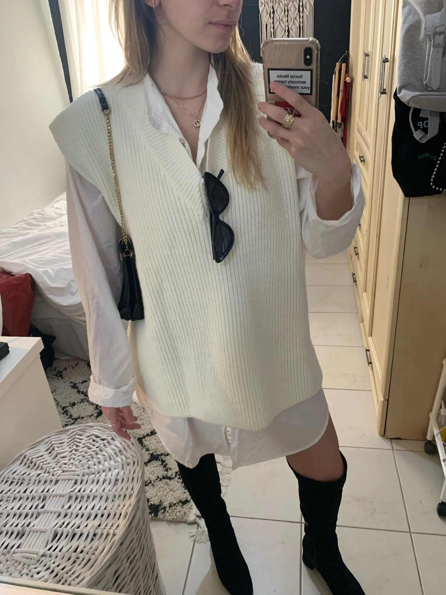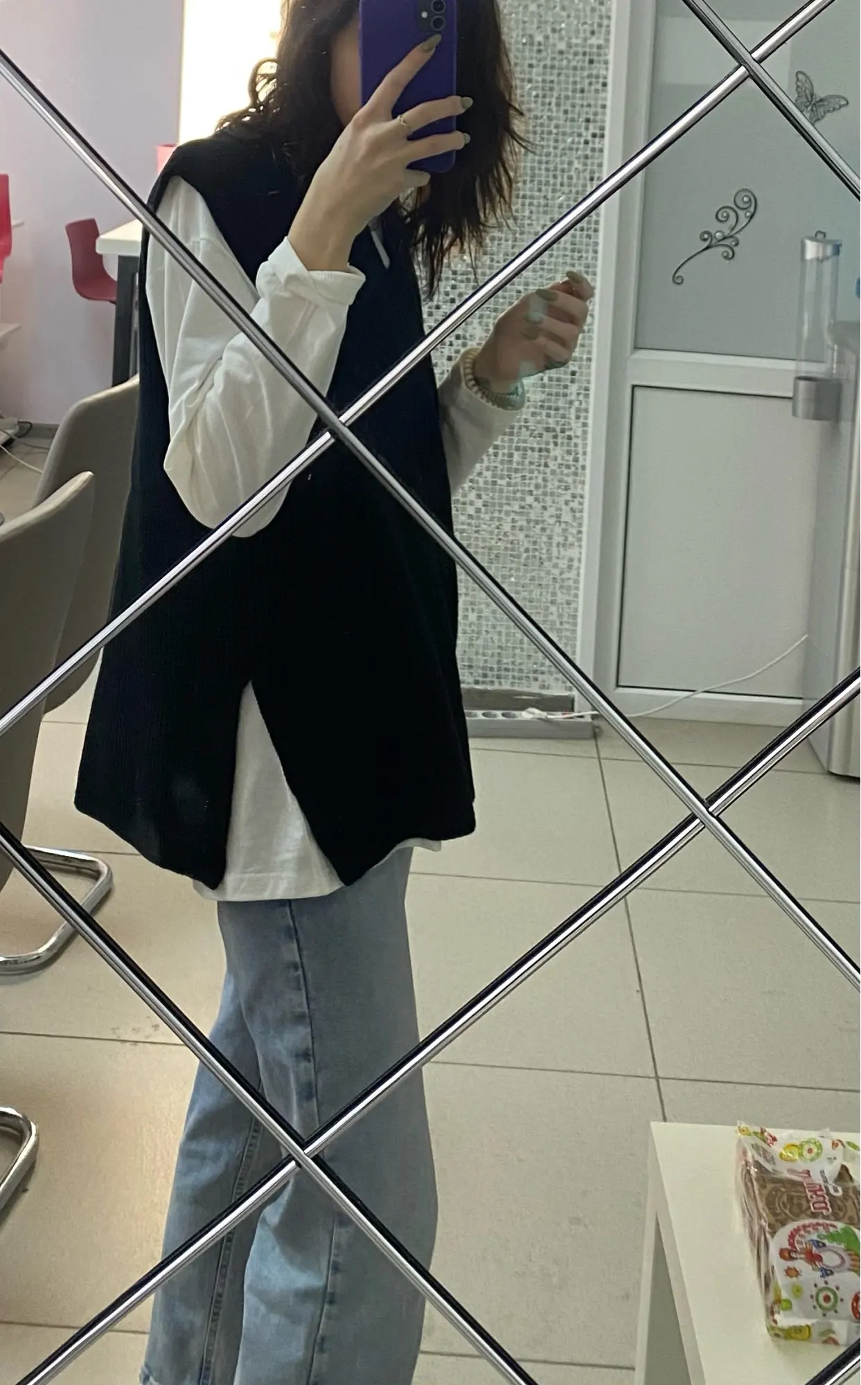 Хороший жилет, плотная вязка, брала на S размер L, сел свободно в стиле оверсайз, длина тоже хорошая.