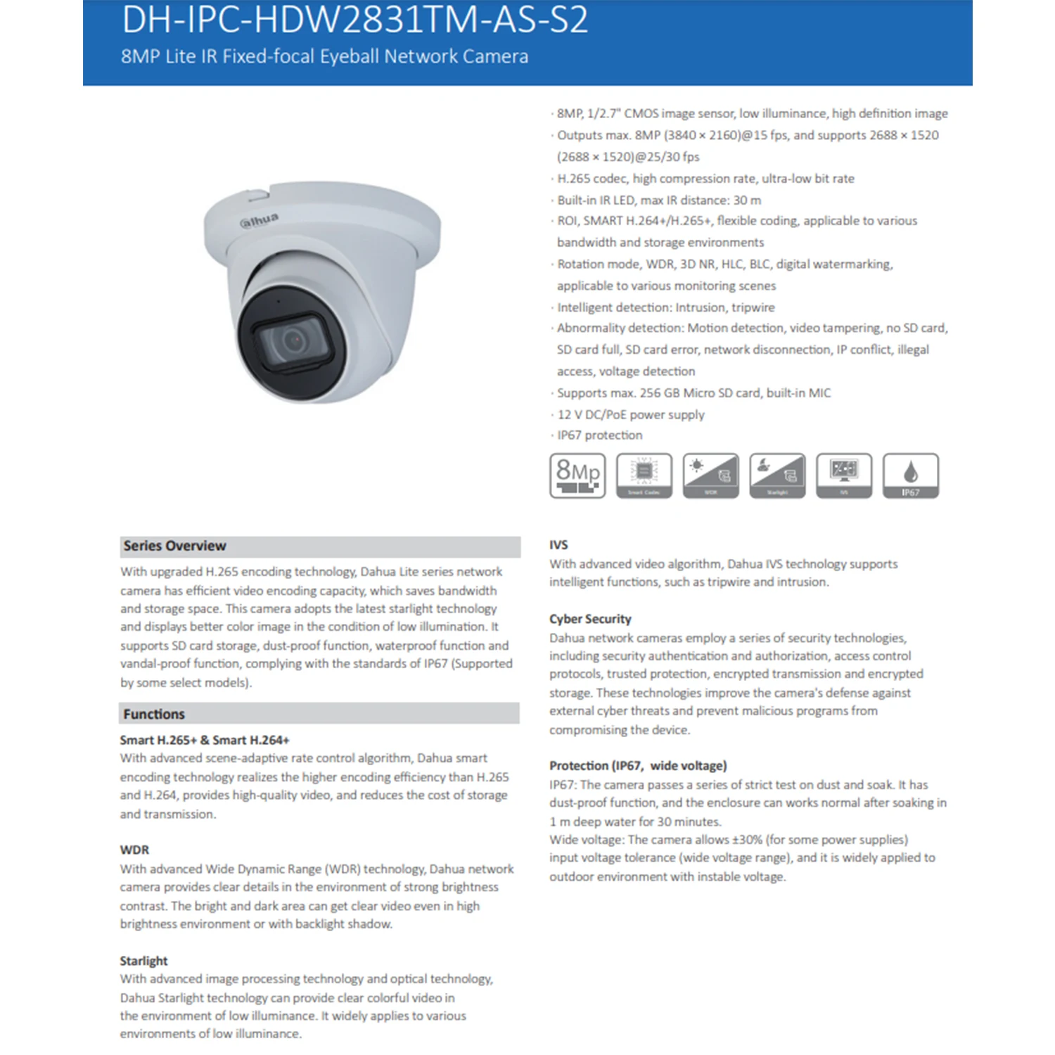 IP-камера Dahua 8 МП 4K HD, фотосессия H.265 + IR30M, поддержка SD-карты, встроенный микрофон, фотообъектив, Сетевая камера