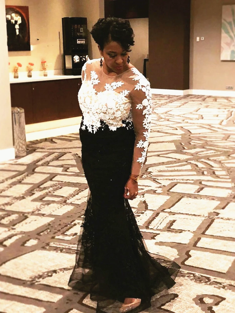 Белое и черное кружевное платье с аппликацией для матери невесты, платье русалки с длинными рукавами, иллюзионный лиф, вечернее платье на выпускной, свадебное платье