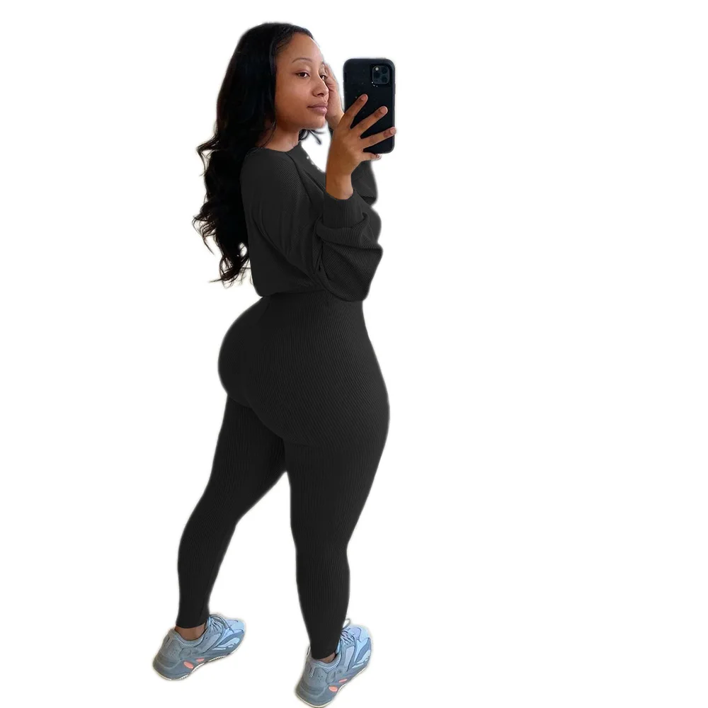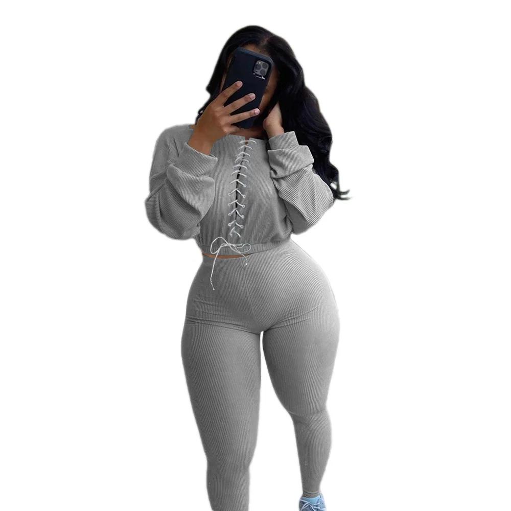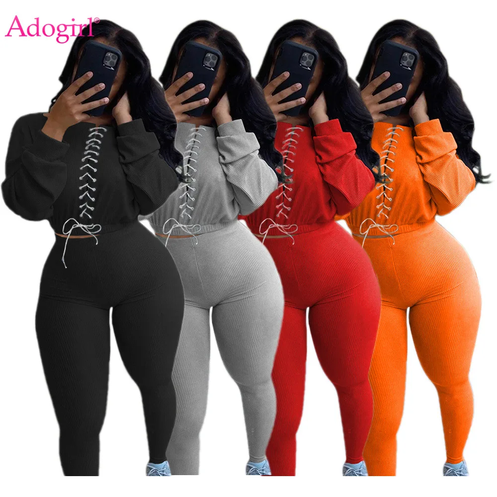 Осенний женский однотонный комплект из двух предметов Adogirl, укороченный Топ с длинным рукавом и люверсами, облегающие брюки, спортивный костюм, повседневный уличный комплект из рубашки