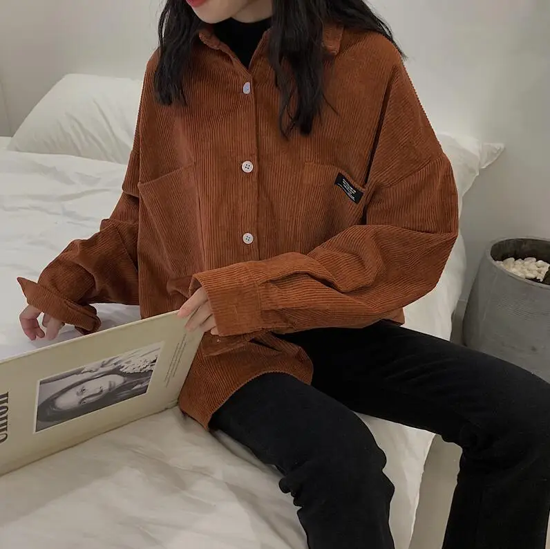 HOUZHOU коричневые винтажные повседневные вельветовые рубашки для ж...