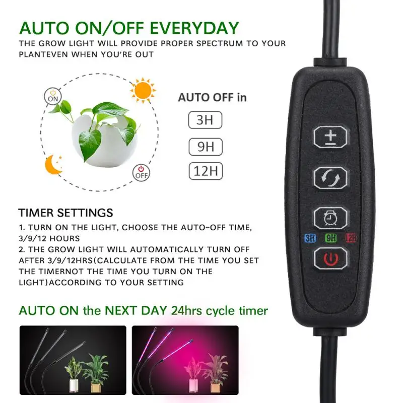 -Функция Таймера Автоматического цикла: Этот светильник для выращивания растений с функцией времени круговой памяти позволяет автоматически включать/выключать (3H/9H/12H) каждый день в соответствии с вашими настройками, которые не требуют ручной работы и заботятся о ваших растениях, когда вы находитесь на работе или отдыхе.