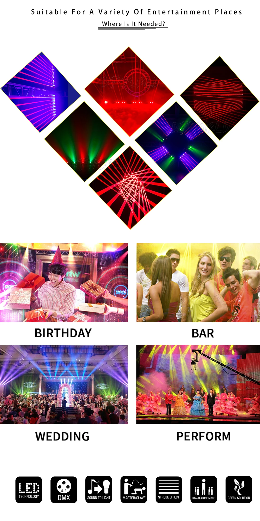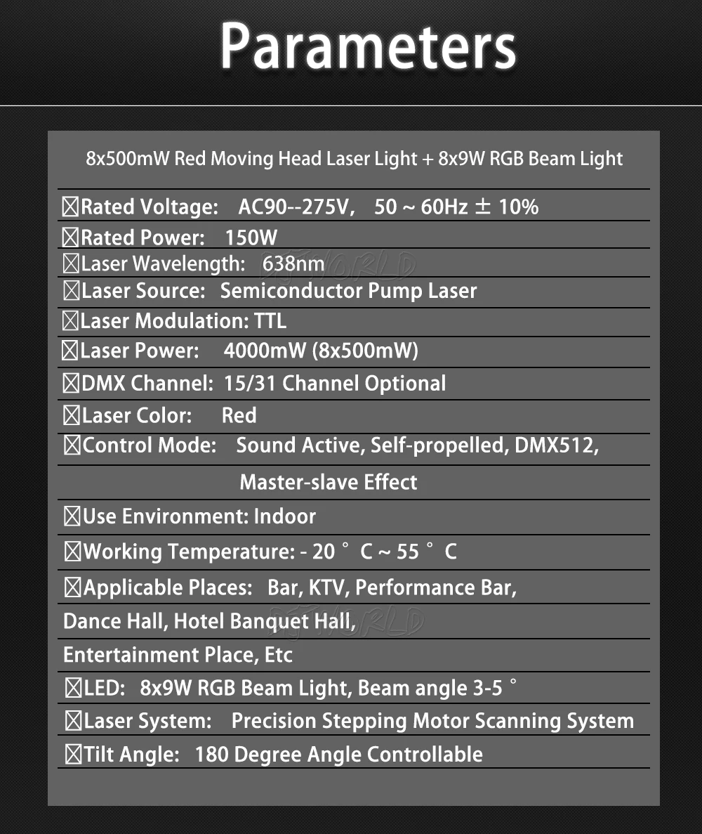 * Название продукта: лазерный светильник с красной движущейся головкой 8x500mW + светильник RGB 8x9W* Номинальное напряжение: AC90V ~ 275V,50 ~ 60Hz ± 10%* Номинальная мощность: 150 Вт* DMX канал: 15/31 канал* Источник лазера: полупроводниковый лазер насоса* Лазерная Модуляция: TTL* Длина волны лазера: 638нм* Мощность лазера: 4000 МВт (8x500 МВт)* Цвет лазера: красный (настраиваемый синий и зеленый)* Светодиодный: 8x9 Вт RGB светильник, угол луча 3-5 °* Лазерная система: Точная Шаговая Система сканирования двигателя,* Угол наклона: угол 180 градусов управляемый.* Лазерный эффект лазерного луча Skynet, лазерный эффект водной линии, лазерный стробоскопический эффект, светодиодный Эффект луча, стробоскопический эффект воды и т. д.* Режим управления: звук активный, самоходный, DMX512, эффект Master-slave* Использование окружающей среды: в помещении* Применимые места: бар, КТВ, представление бар, танцевальный зал, Банкетный зал отеля, Развлекательное место и т. Д.* Рабочая температура-20 ° C ~ 55 ° C