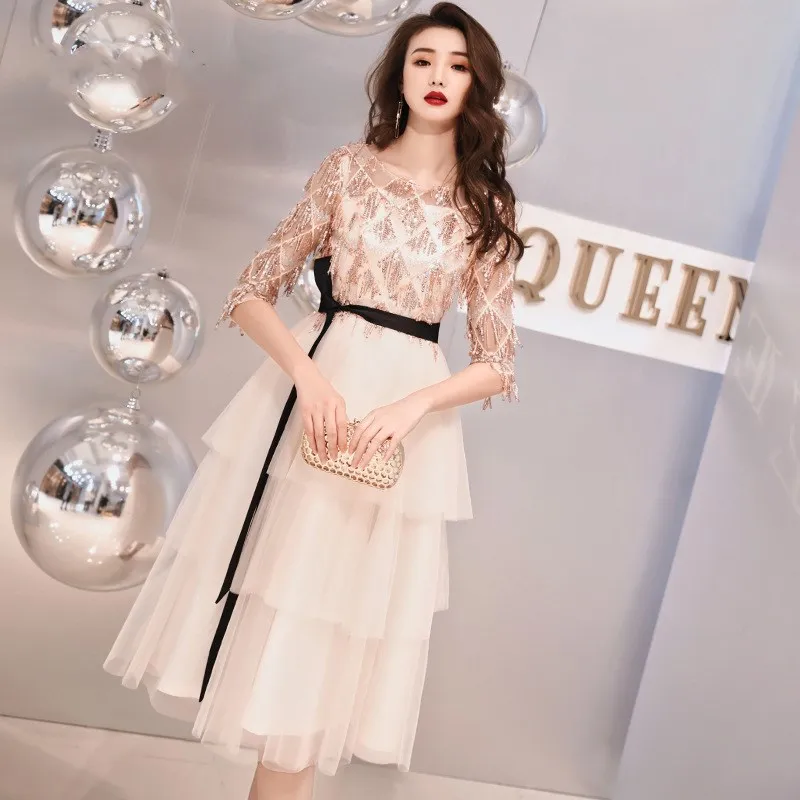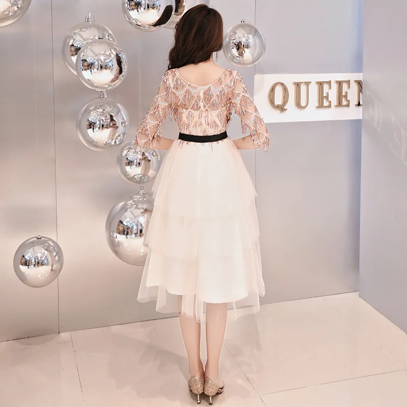 Женское вечернее Платье До Колена, очаровательное платье цвета шампанского с круглым вырезом, блестками, кисточками и рукавом до локтя, платье цвета шампанского с аппликацией