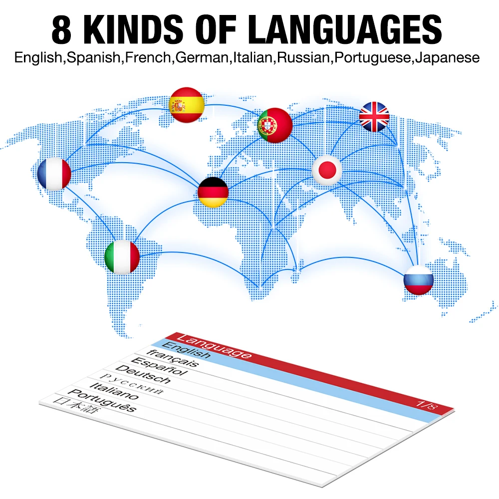 Английский, французский, испанский, немецкий, итальянский, русский, португальский, японский.