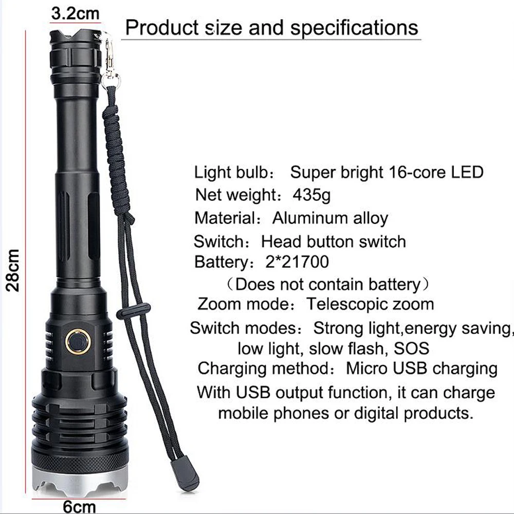 Модель лампы: P110 -16 основной светодиодныйМатериал линз: оптические линзыРабочая передача: 5 передач (сильный, средний, слабый, быстрый мигание, медленное мигание)Размер продукта: 28 см длина x 6 см x 3,2 cm Хвост/литая шина 31x6x3,2 см (длина после увеличения)Применимый аккумулятор: 21700 батареи * 2 (10000 мАч)Класс водонепроницаемости: IPX5 (водонепроницаемый, непромокаемый)Мощность продукта: 50 ВтМатериал изделия: алюминиевый сплавРабочее Напряжение: 7,4 ВЦвет изделия: черный/серебристыйПрямая зарядка: Прямая зарядка через USBZommable: Телескопический фокусПоложение переключателя: переключатель средней кнопкиДисплей питания: 4 светодиодный индикатор, каждый светильник имеет 25% Емкость аккумулятора: 5000 мАч * 2Вес нетто продукта: 435 г (фонарик)Универсальное зарядное устройствоЭто зарядное устройство поддерживает литиевый аккумулятор 18650 , 14500 , 26650 ,21700 и т. Д...