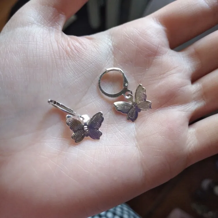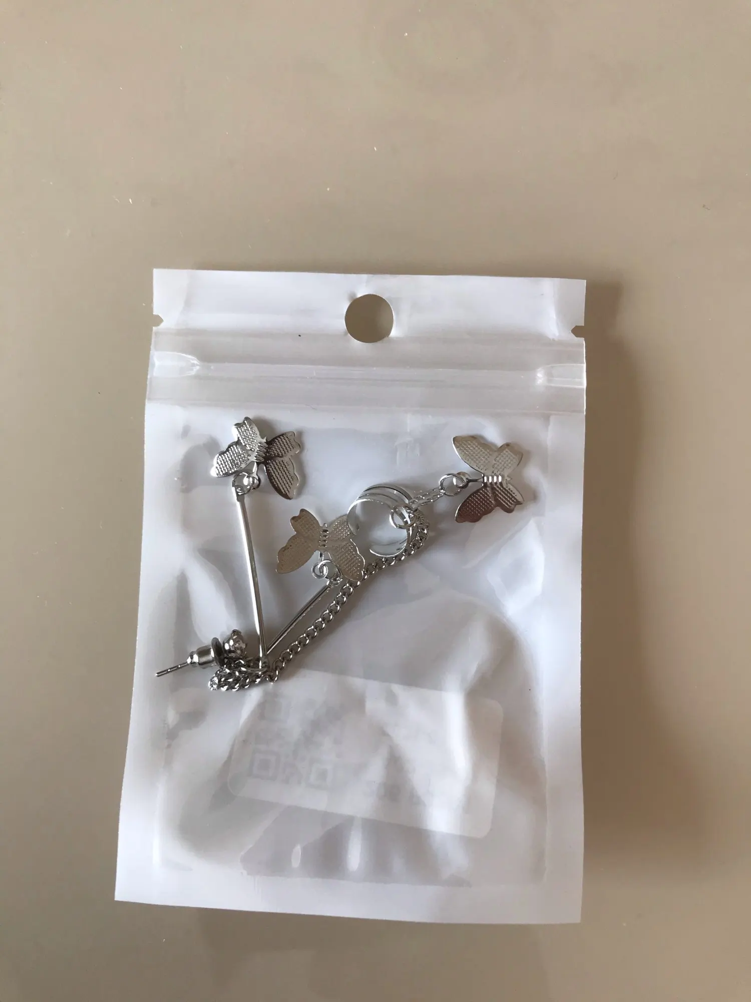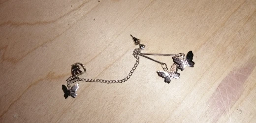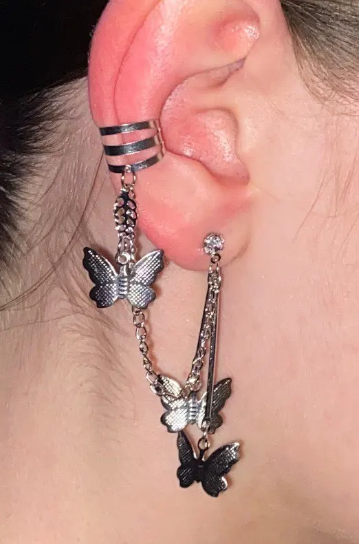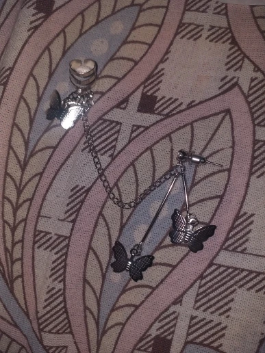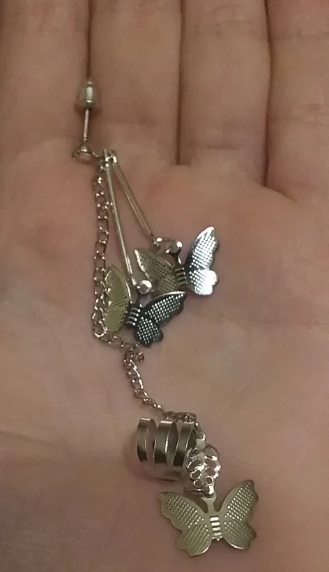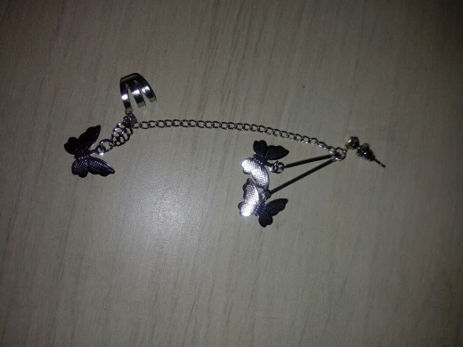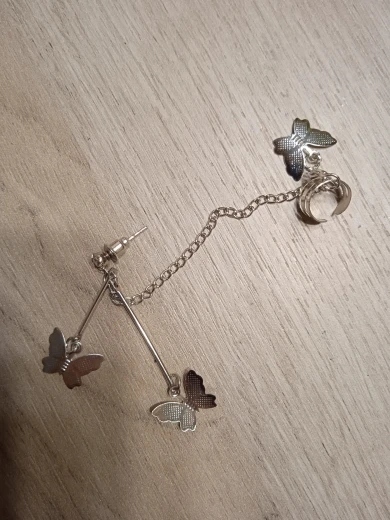 пришло в идеальном состоянии. качеством довольна. верхняя часть регулируется (ну насколько можно зажать на ухе). бабочки выглядят хрупкими, но на деле все хорошо. товаром довольна, посмотрим поменяет ли цвет металл.