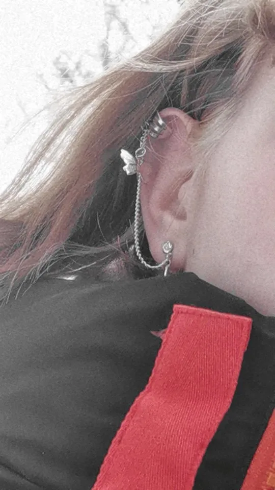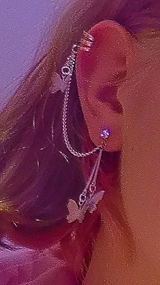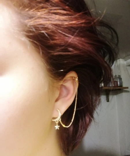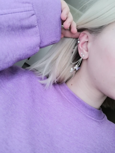 выглядит очень нежно, верхний прокол фейковый, серёжка лёгкая, прикольно звенит, хаха :) пришла +/- за 26 дней, качественная