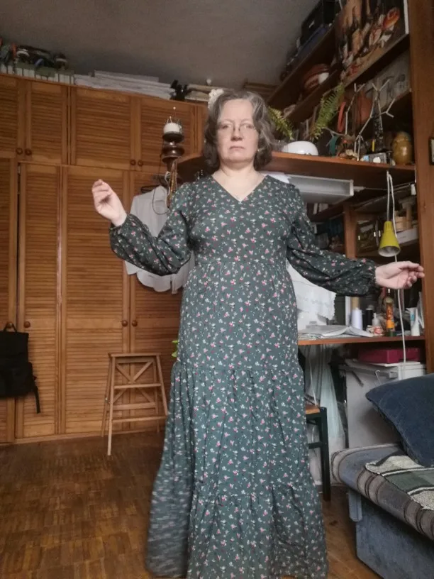Хорошее платье. очень длинное, но с ремнем хорошо. Немного длинные рукава, но они на резинке. На груди и спине вытачки. На спине молния, Ткань легкая, немного просвечивает, мнется мало. Хорошее качество пошива.