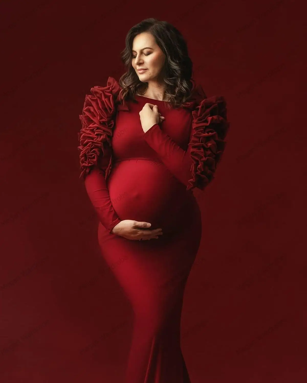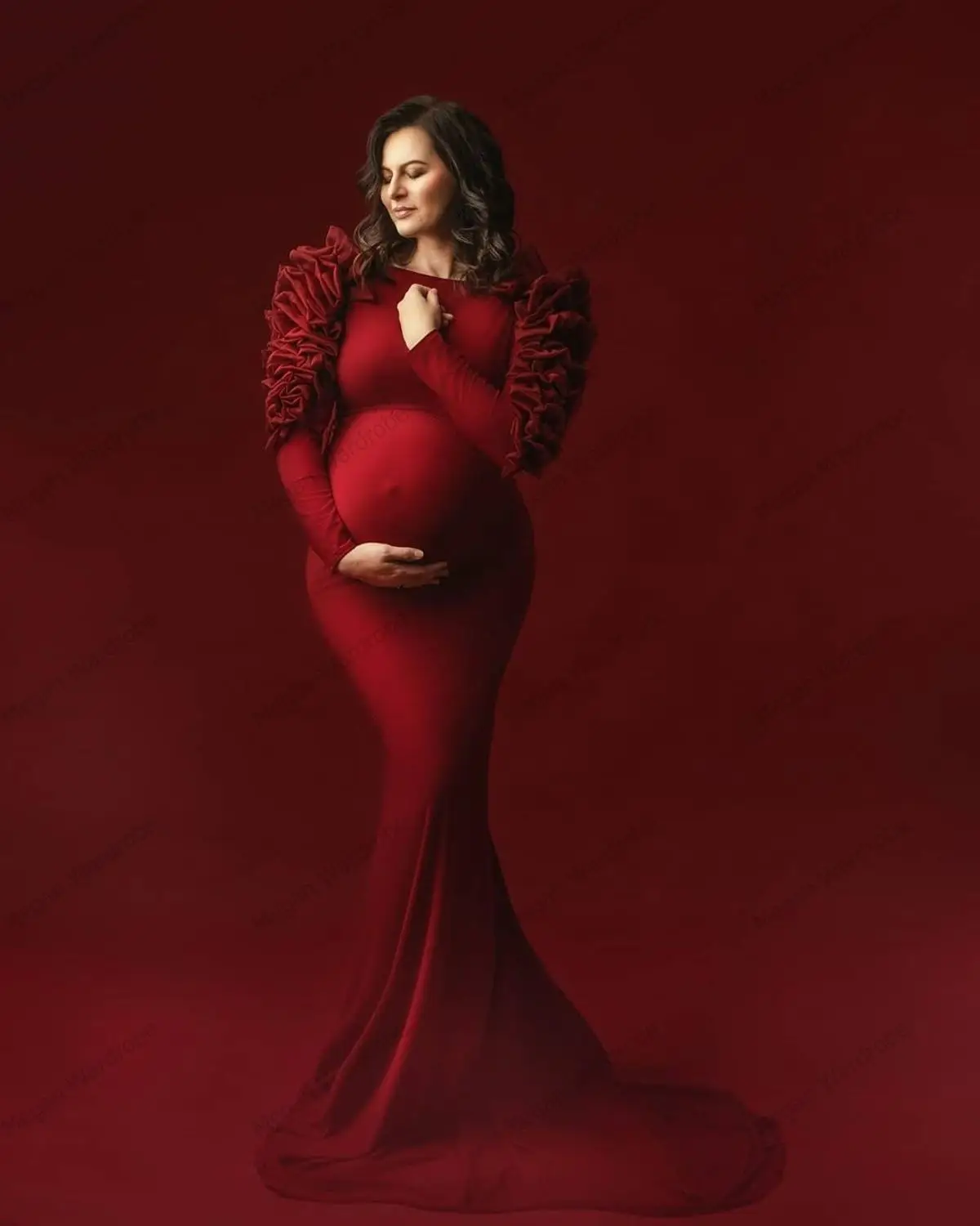 Элегантные красные платья русалки для беременных с длинными рукавами из спандекса изготовленные на заказ тюлевые пышные рукава уникальное платье для фотосъемки для беременных