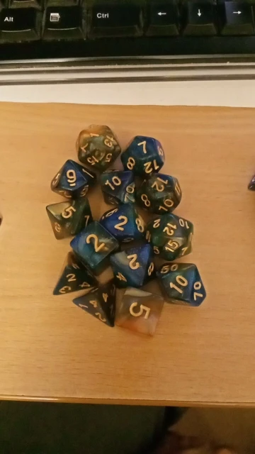 Каждый цвет поставляется с 7 разными кубиками: 4, 6, 8, 10, 12, 20 сторонними кубиками.