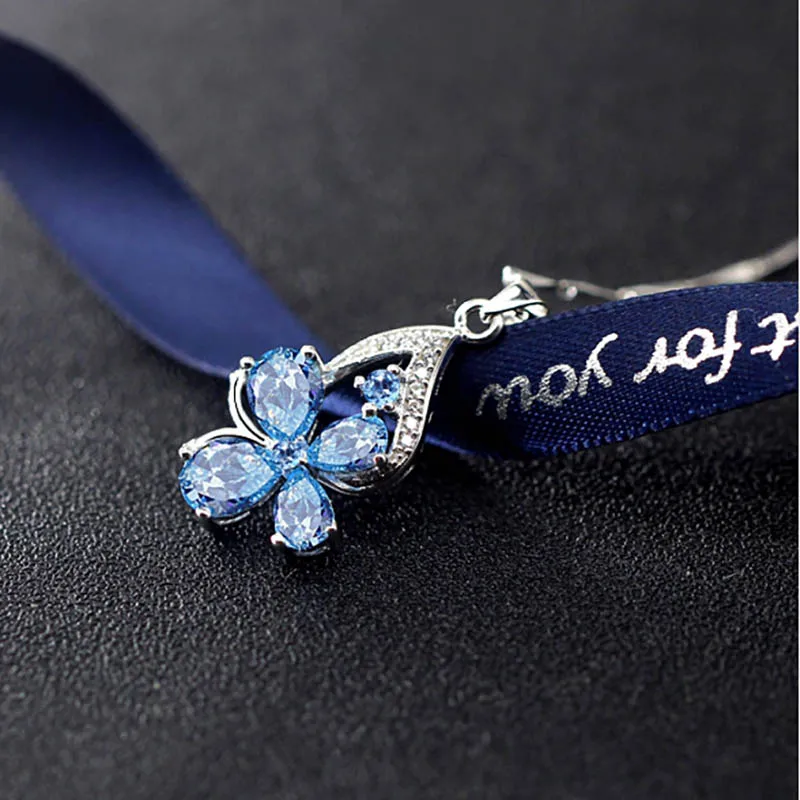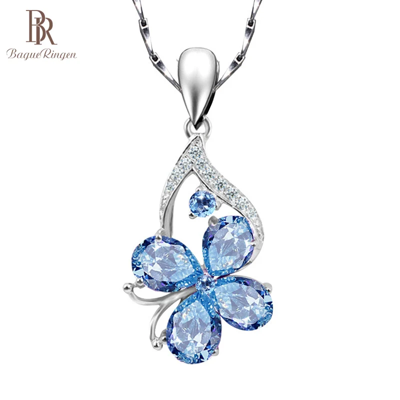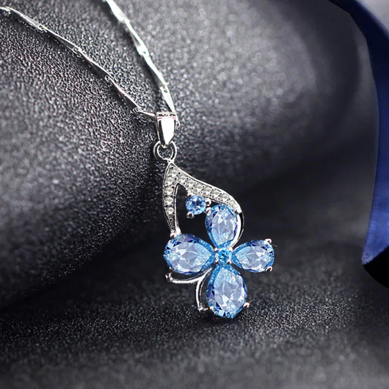Женское ожерелье из серебра 925 пробы с подвеской в виде клевера, подвеска в форме капли воды, подвеска из аквамарина, цепочка до ключиц с бабочкой
