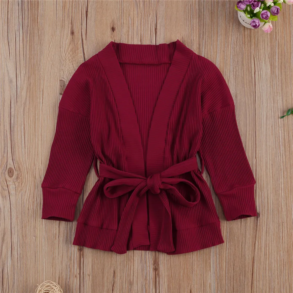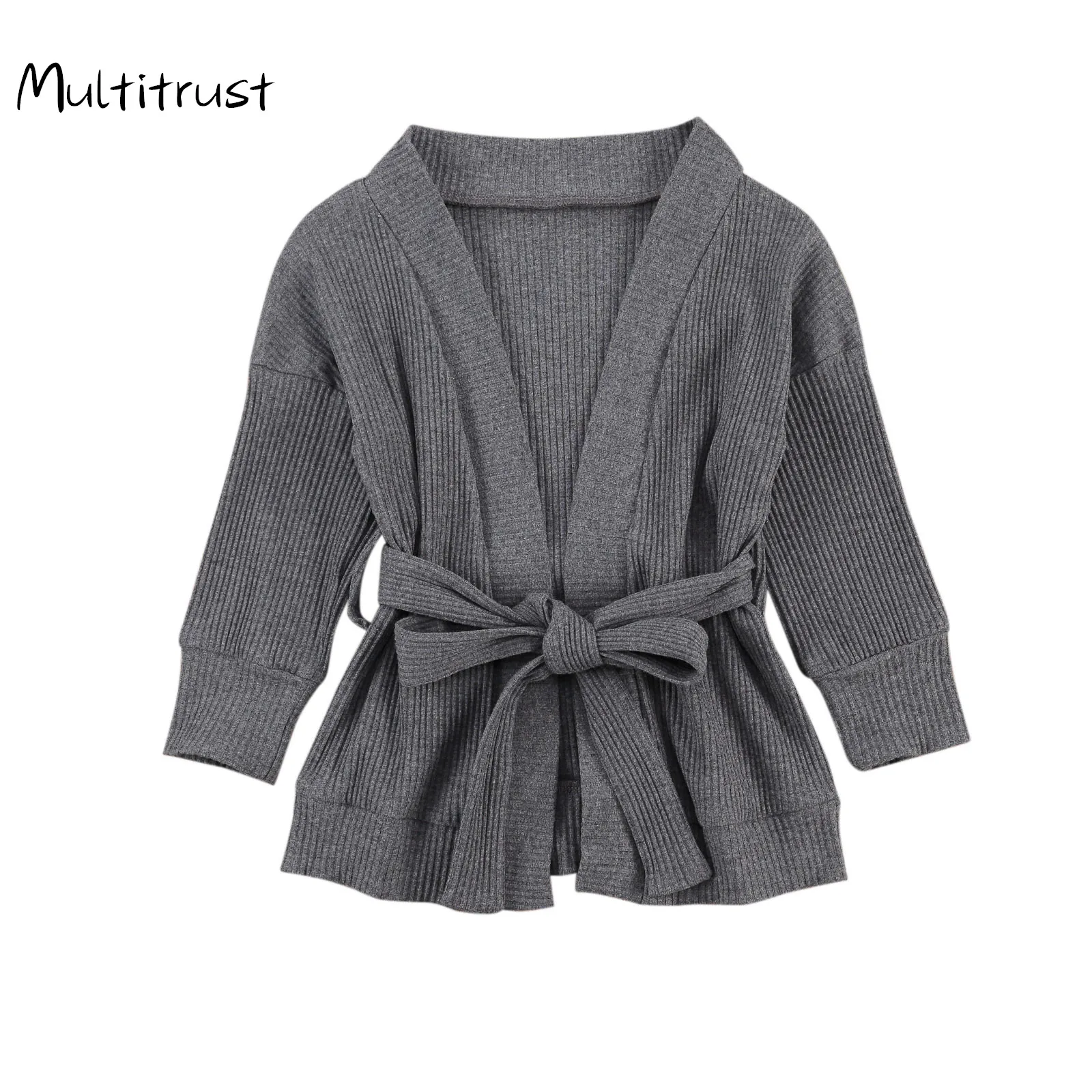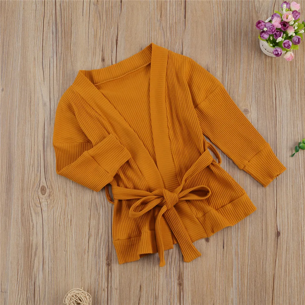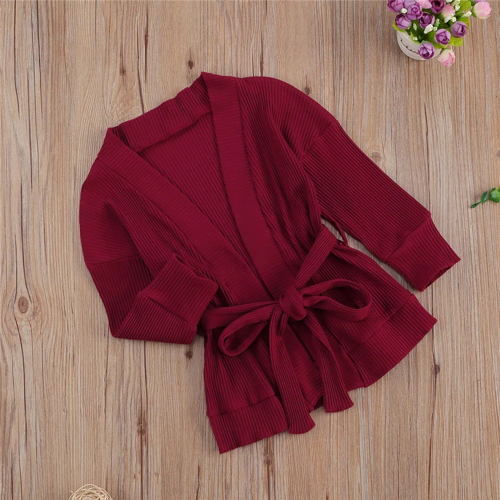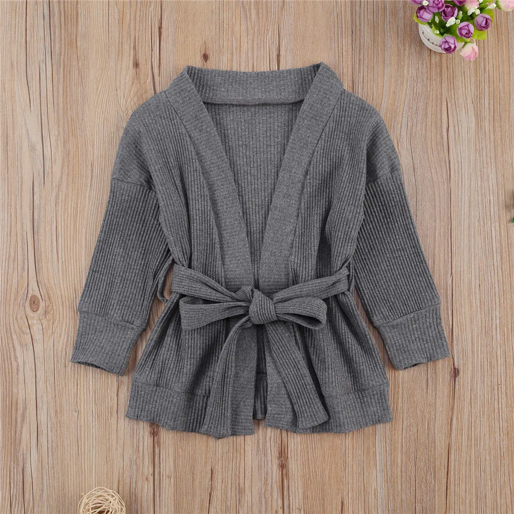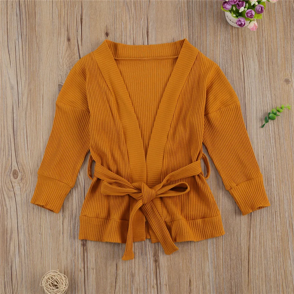 Осень 2020, Классические кардиганы для маленьких девочек, пальто с открытыми плечами и длинным рукавом, вязаный свитер из чесаного хлопка с поясом и шнуровкой на талии