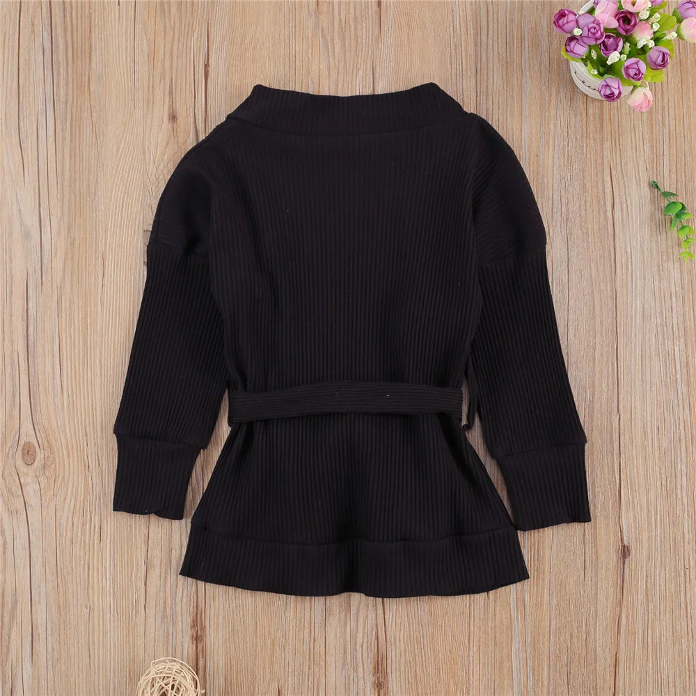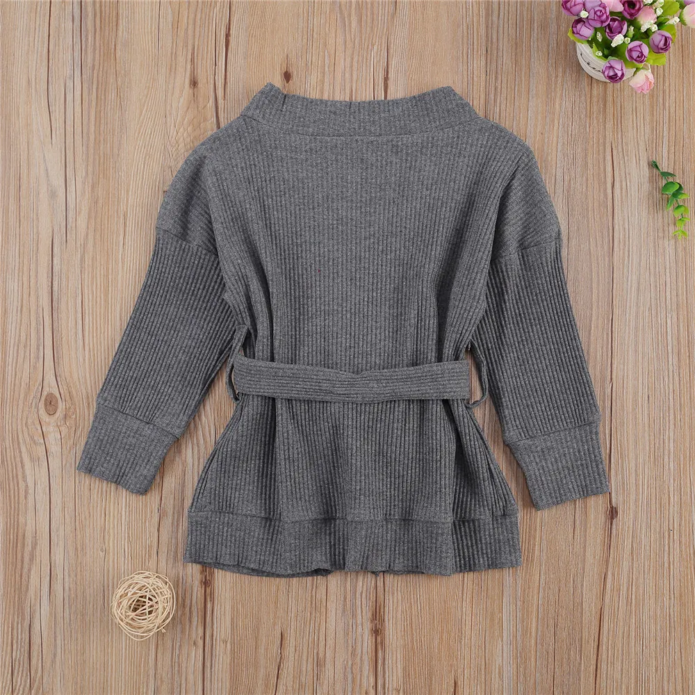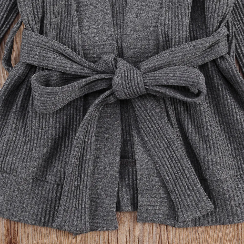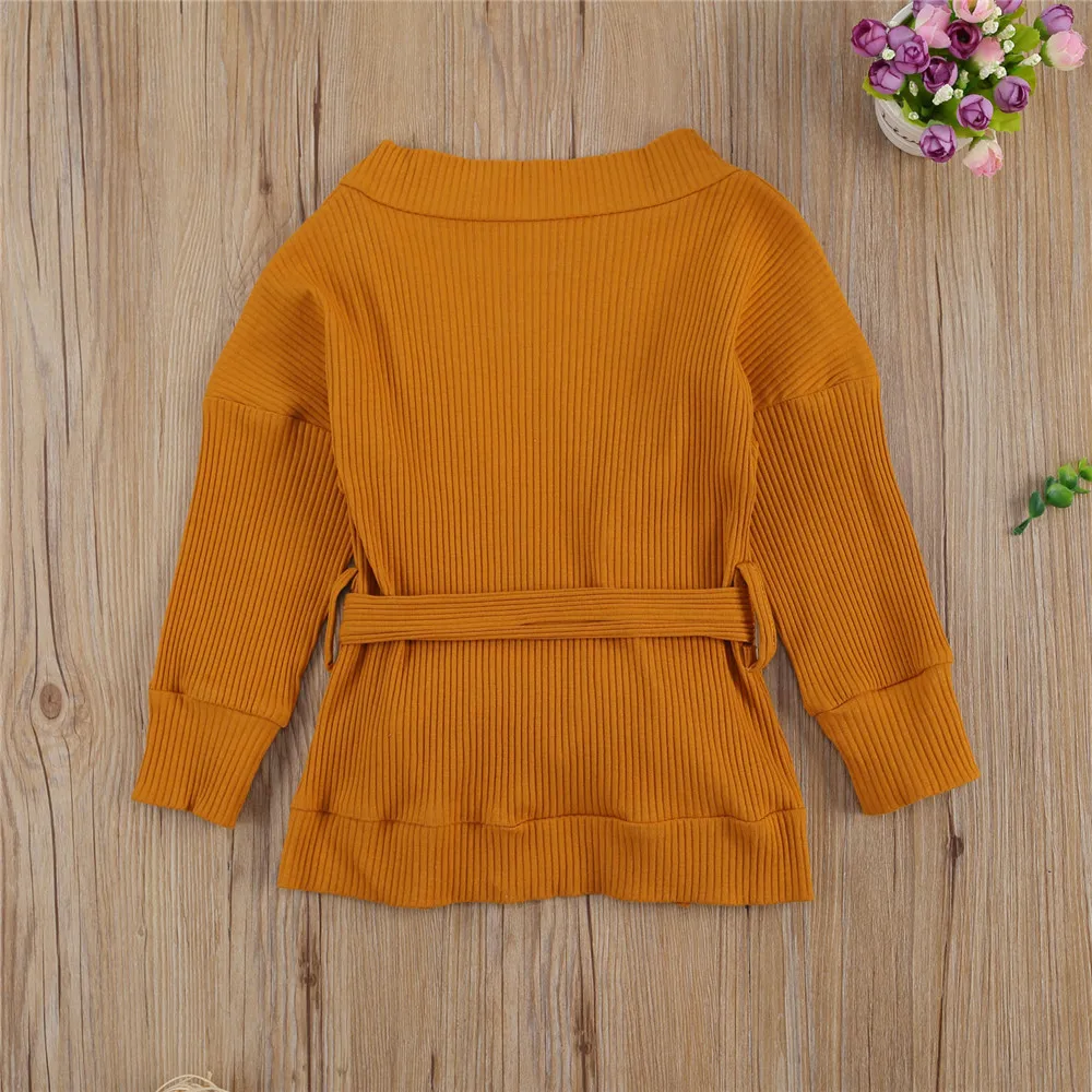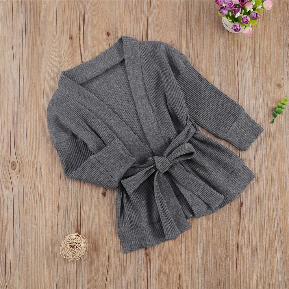 Осень 2020, Классические кардиганы для маленьких девочек, пальто с открытыми плечами и длинным рукавом, вязаный свитер из чесаного хлопка с поясом и шнуровкой на талии