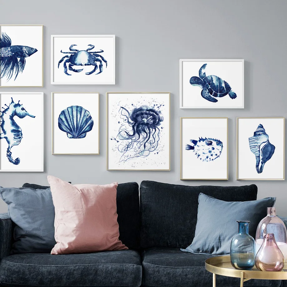Морские животные, темно-синие хамптоны, морская черепаха, детская комната, Картина на холсте, скандинавский постер, Настенная картина, украшение для детской комнаты