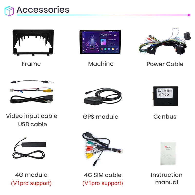 1. Штифт-штифт: Кабель питания Junsun radio' является штифтом для штифта, прост в установке;2. Встроенный Carplay/ Android Auto: Поддержка версии V1Pro, просто используйте кабель телефона, подключите его, стабильный и простой в использовании; (V1 поддерживает только Android Auto, но нужно покупать; V1C не поддерживает)3. Поддержка подголовника: только поддержка версии Junsun V1;