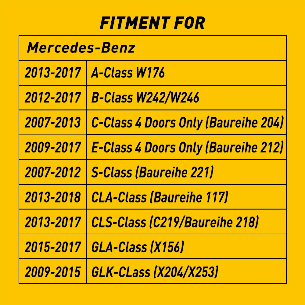 Для Mercedes A Class W176Для Mercedes B Class W242 W246 2012-2017Для Mercedes GLA C Class X156 2015-2017Для Mercedes GLK Class X204 X253 2009-2015Для Mercedes S-класса (Baureihe 221) 2007-2012Для Mercedes CLA Class (Baureihe 117) 2013-2018Для Mercedes CLS Class (C219/Baureihe 218) 2013-2017Только для дверей Mercedes C класса 4 (Baureihe 204) 2007-2013Только для дверей Mercedes E класса 4 (Baureihe 212) 2009-2017