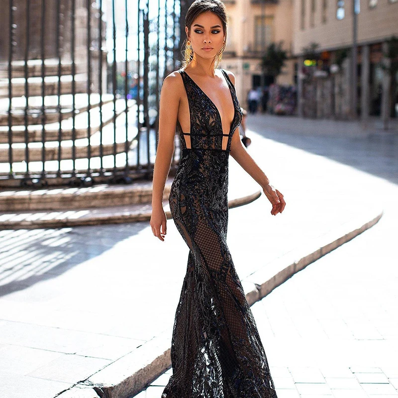 Черное вечернее платье-Русалка с V-образным вырезом и открытой спиной