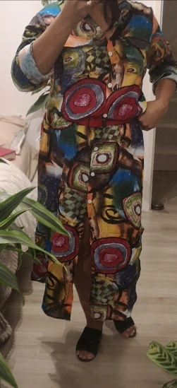 Туника очень стильная. Расцветка точно соответствует фото. Ткань тонкая, нежная, но не прозрачная. По ощущениям, тонкий хлопок. На рос. 50 брала XL. Всё подошло. на рост 175 см длина почти до щиколотки. Можно носить с джинсами, а можно как отдельное платье-рубашку. К покупке советую!