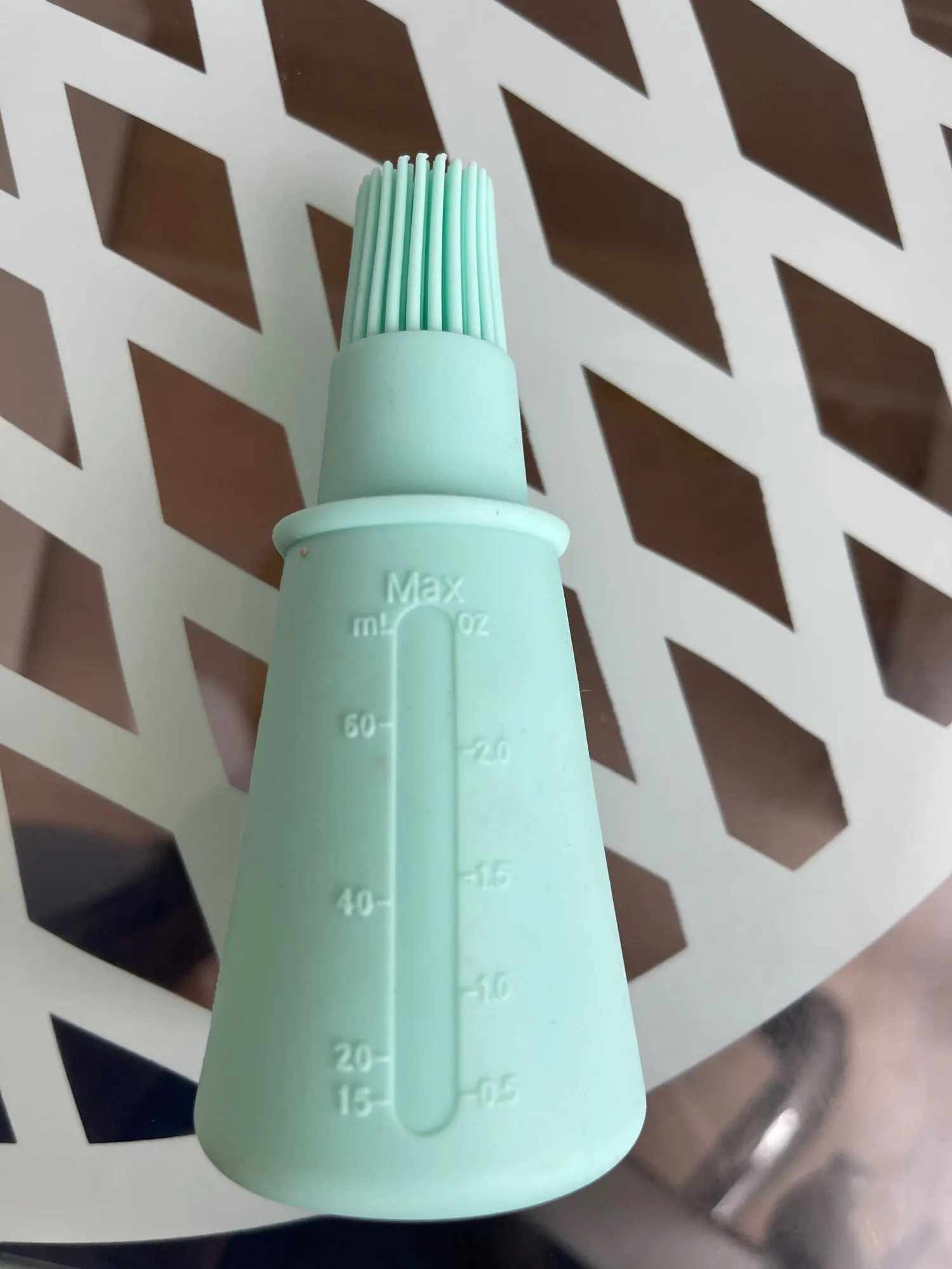Товар пришел без задержки. На мой взляд слишком мягкая форма и я не решился заолнять полностью (боюсь потечет). С обратной стороны присоска, то схватыет, то нет поверхность стола. Я не рискнул наполненную маслом ставить вертикально.