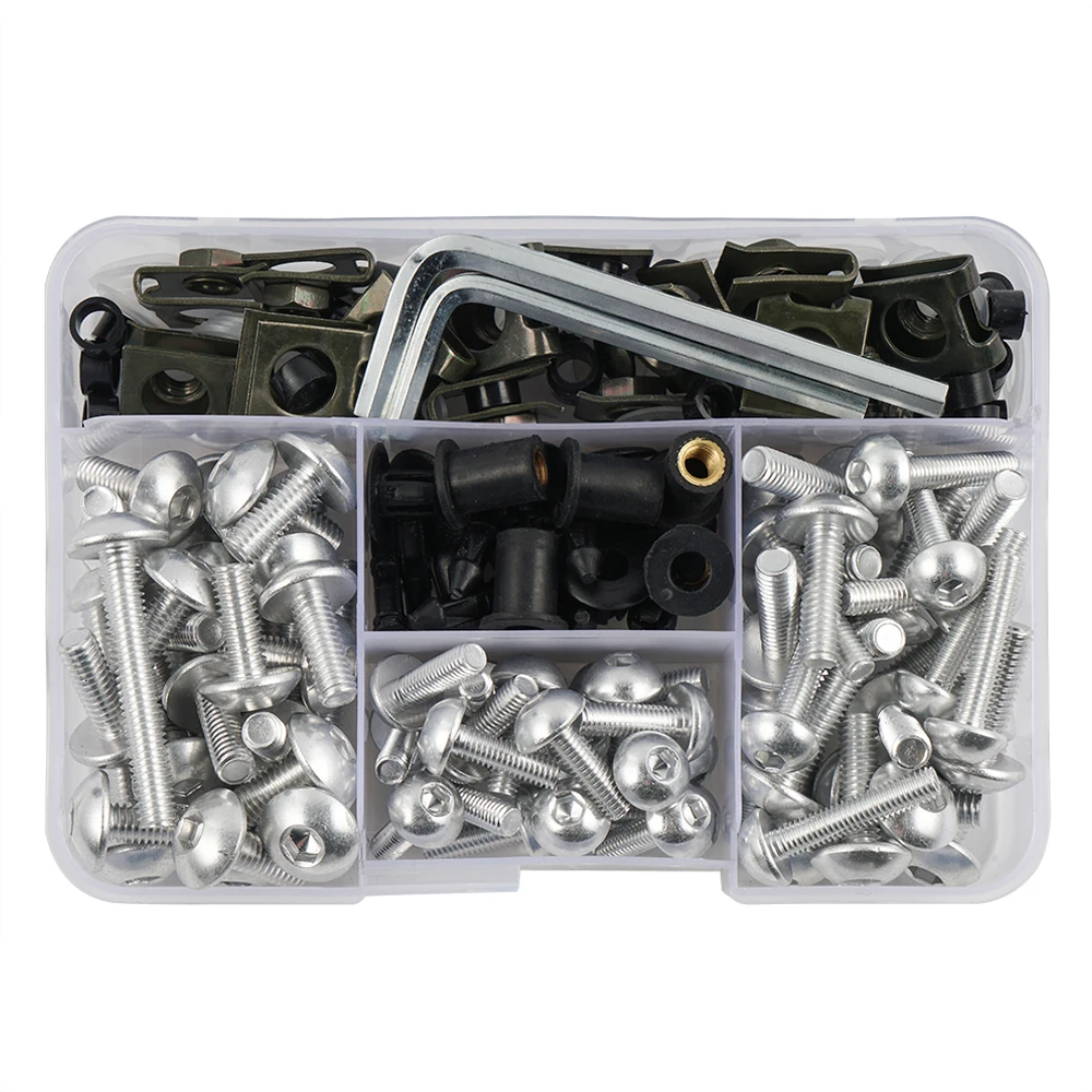 Посылка включает в себя: (с пластиковой коробкой)(* 74 болта и 116 аксессуаров) 190 штБолты M6- (6x40 мм) x 6 шт.Болты M6- (6x16 мм) x 20 шт.Болты M6- (6x20 мм) x 20 шт.Болты M5- (5x16 мм) x 20 шт.Болты M5- (5x25 мм) x 8 шт.Зажимы скорости x 14Крепежные винты x 5Гайка колодца х 5Нейлоновые шайбы для 6 мм x20Нейлоновые шайбы для 5 мм x20M6 пластиковая стойка x 20M5 пластиковая стойка x 20Обтекатели: M6x5, M8x5Шестигранный ключ: M5x1 M6x1