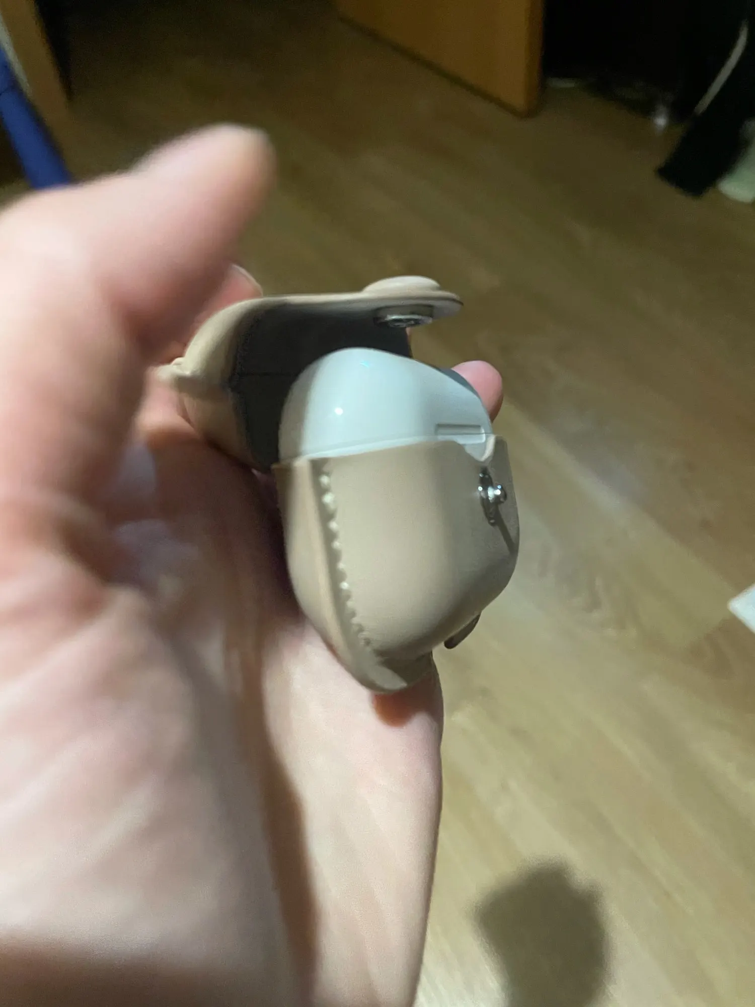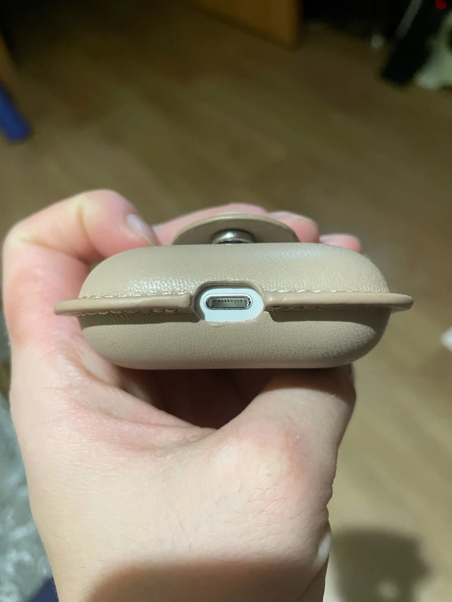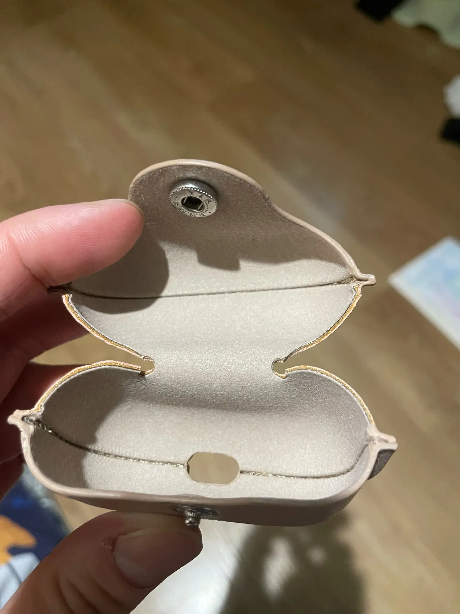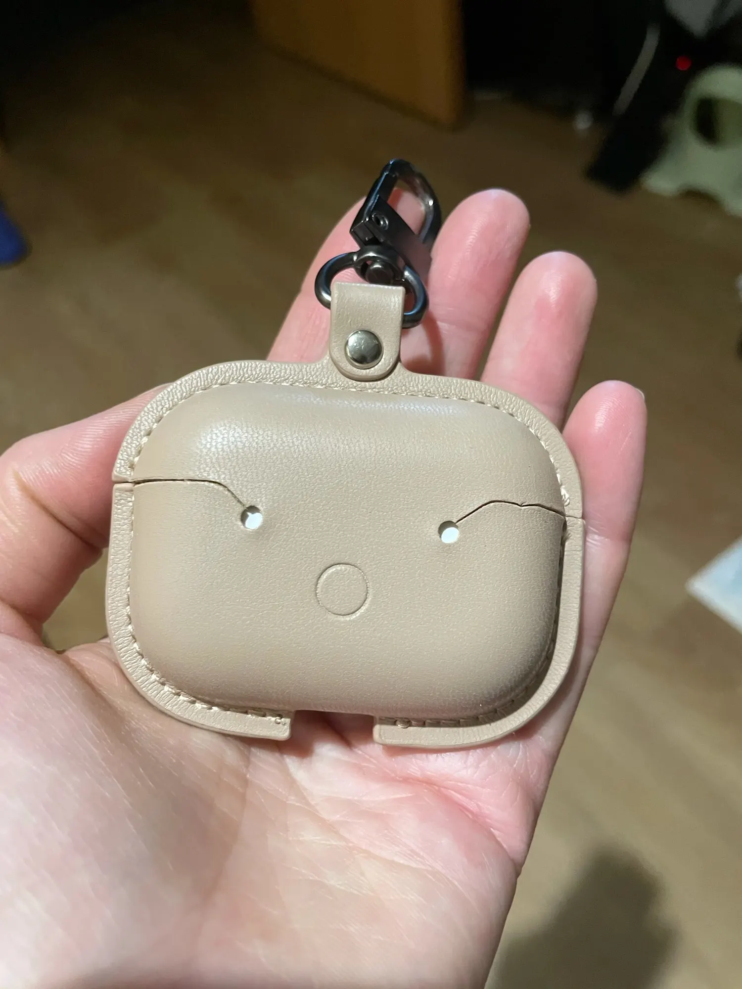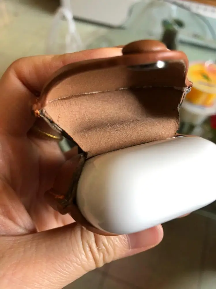 Чехол скорее цвета кофе с молоком , а не бежевый . Сшит аккуратно , единственный минус крышка чехла открывается отделено от крышки AirPods , то есть сначала открываешь чехол , затем крышку устройства и кнопка туговато закрывается .