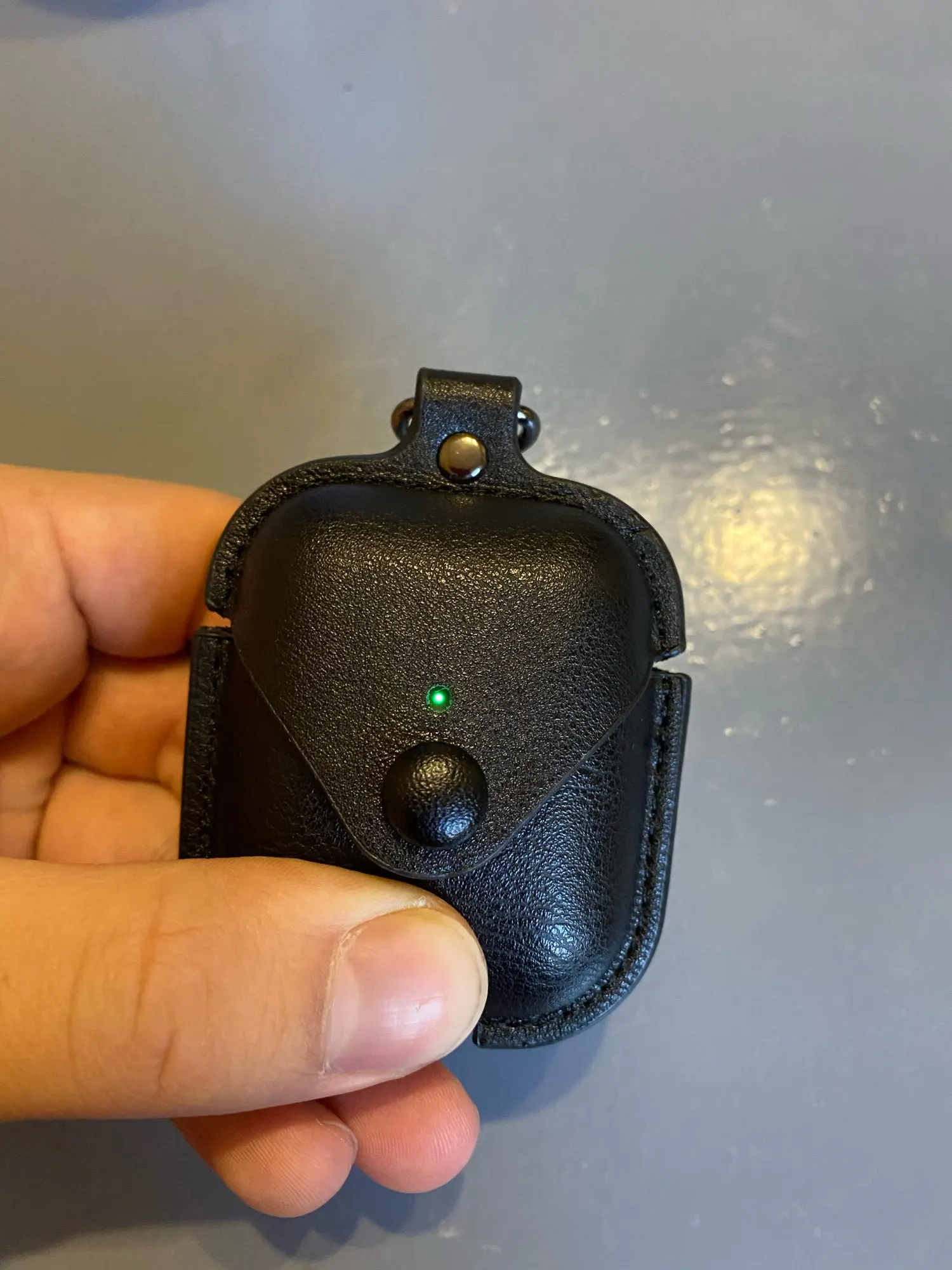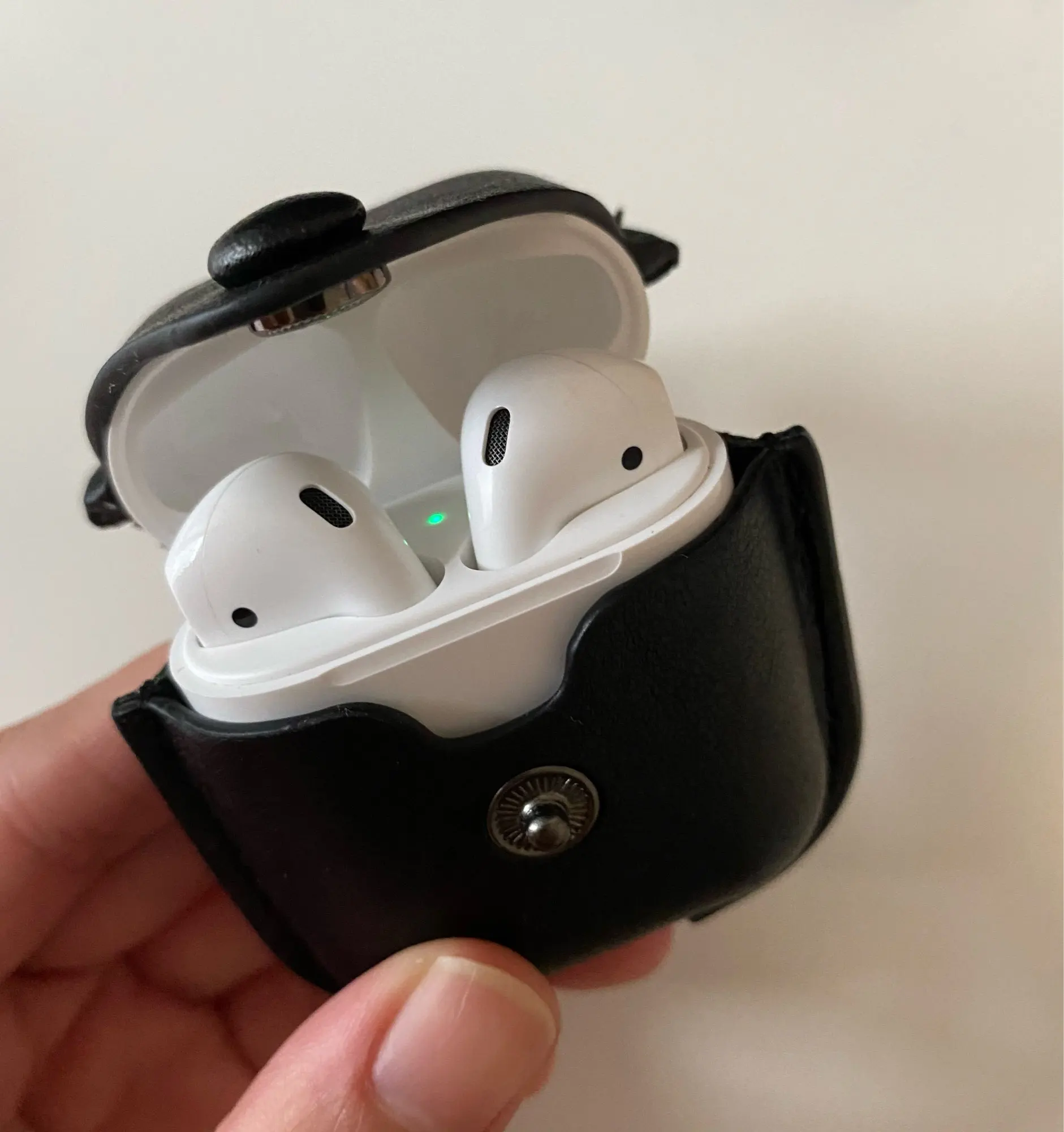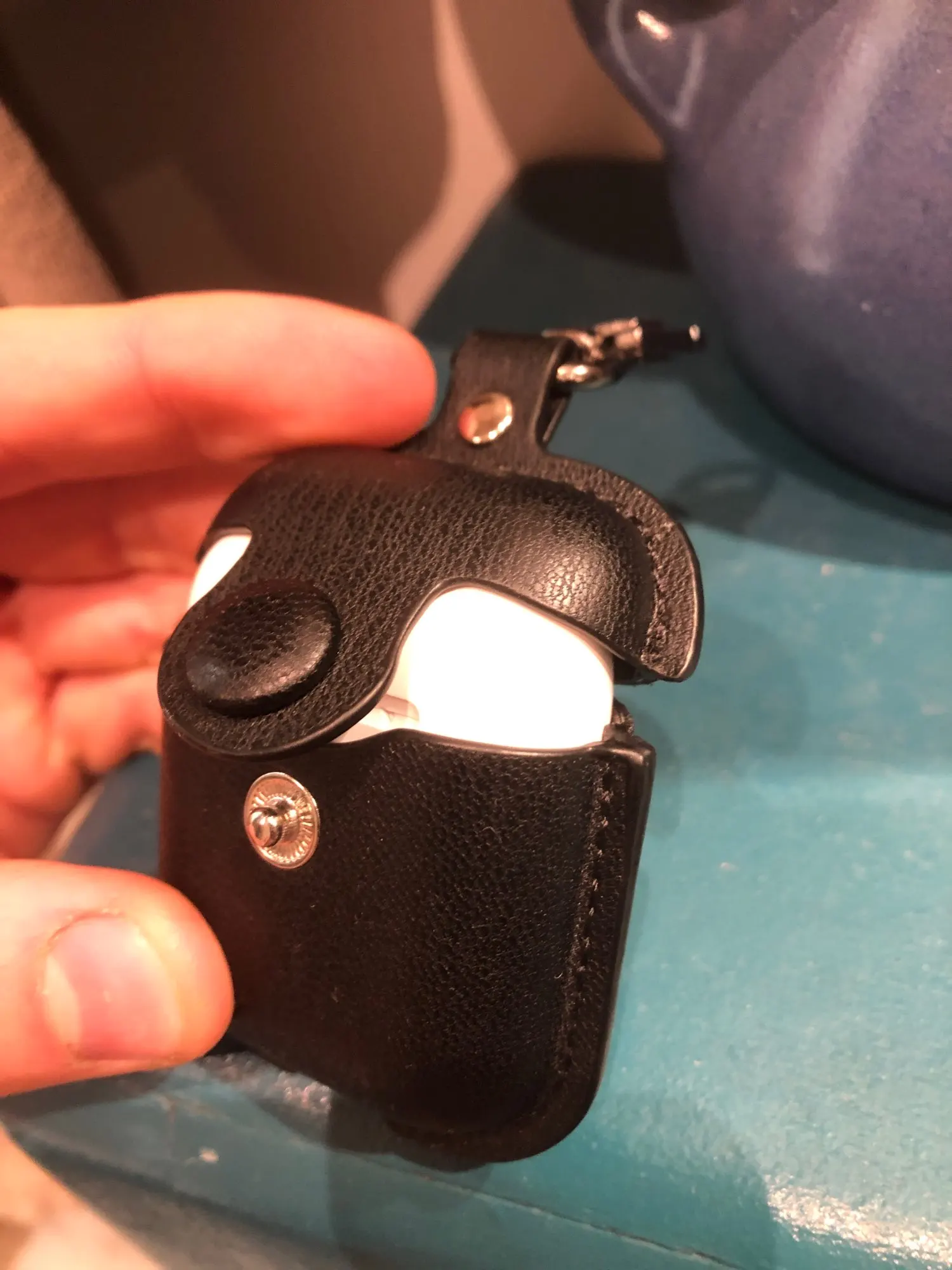 Тоньше ожидаемого. Чехол немного меньше, поэтому, когда Airpods в нем, мне сложно нажать на кнопку. Когда я открываю его, Airpods не открывается с чехлом (посмотрите на изображение). Я думаю, что мне придется просто положить немного ленты для его прилипания, чтобы он мог открыть вместе