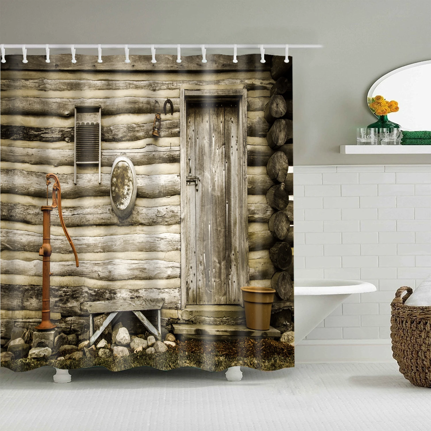 Занавеска для ванной с деревянной дверью и крючками, в винтажном стиле