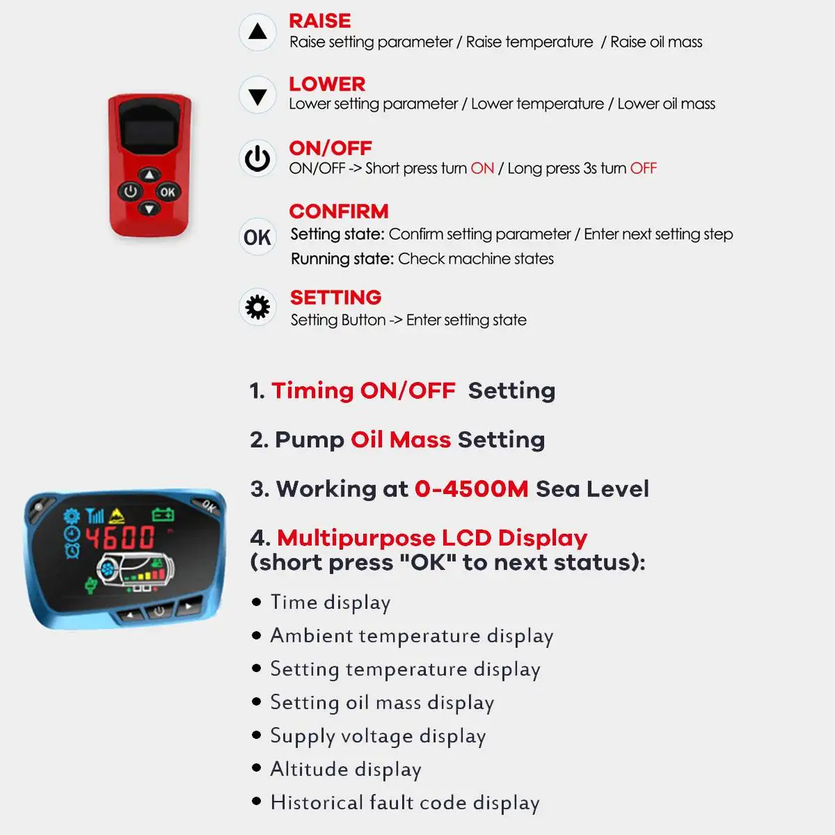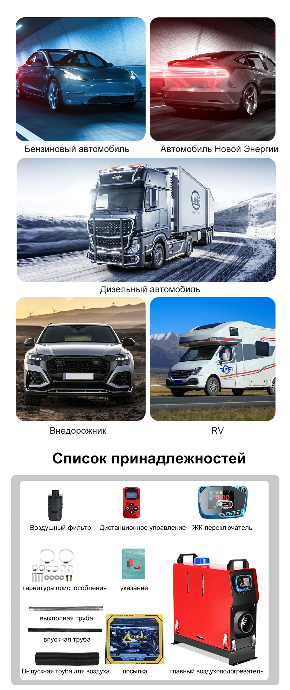 Посылка включает:1 хост воздушного нагревателя1 x ЖК-ключ1 пульт дистанционного управления2 х впускной трубы1 х выхлопная труба6 х соединительных труб для масла1 х масляный насос1 х воздушный фильтр1 х Кабель питания1 x Монтажные кронштейны1 Инструкция Спецификация:Материал: металл + пластикМощность: 1-8000 ВтНапряжение: 12 ВЦвет: красный + черныйРазмер: 42*41*15,5 смТопливо: ДизельПолный коэффициент сгорания: 100%Расход топлива: 0,1 литров/час маслоРабочая температура: -40 ℃ ~ 80 ℃Размер: 41*15,5*42 см/16,2*6,1*16,5" Особенности:-Может использоваться на больших высотах, 1500 метров над уровнем моря.-Нагреватель может быть применен для нагрева кабины грузовых автомобилей, грузовиков, аккумуляторных батарей автомобилей и всех видов других транспортных средств.-Может устранить Мороз окна;-Экологически чистый продукт, низкий уровень выбросов, низкий расход топлива; Выхлопные газы нагревателя для удовлетворения требований к выбросам двигателя евро IV.-Компактная конструкция, легко устанавливается;-Может демонтировать новый автомобиль при замене транспортного средства.-Летучая технология, с помощью керамической вилки зажигания нагревание топлива испаряется в газ, быстрое зажигание, полное сгорание.-Использование передовой технологии автоматического управления с надежными ненормальными условиями эксплуатации.-Топливо, электричество, температура может быть установлена произвольно.-Новый воздушный Нагреватель-это второе поколение модернизированных продуктов, воздушное судно поддерживает Оригинальное экономичное и экономичное нагревание на основе характеристик увеличения функций дистанционного управления, чтобы сделать управление более простым и удобным. Для увеличения фиксированного кронштейна баланс крыльчатки вентилятора более стабильный, уменьшая шум.-Простота установки, экономичность и удобство. Может использоваться в качестве размораживания оконного стекла, но также для кабины, студии, каюты теплоизоляционных услуг.