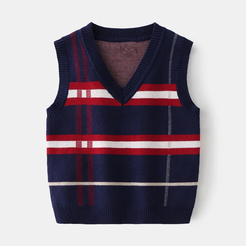 Модный повседневный осенний Детский свитер для мальчиков, клетчатый вязаный свитер с отложным воротником, хлопковый жилет с воротником, кардиган для мальчиков