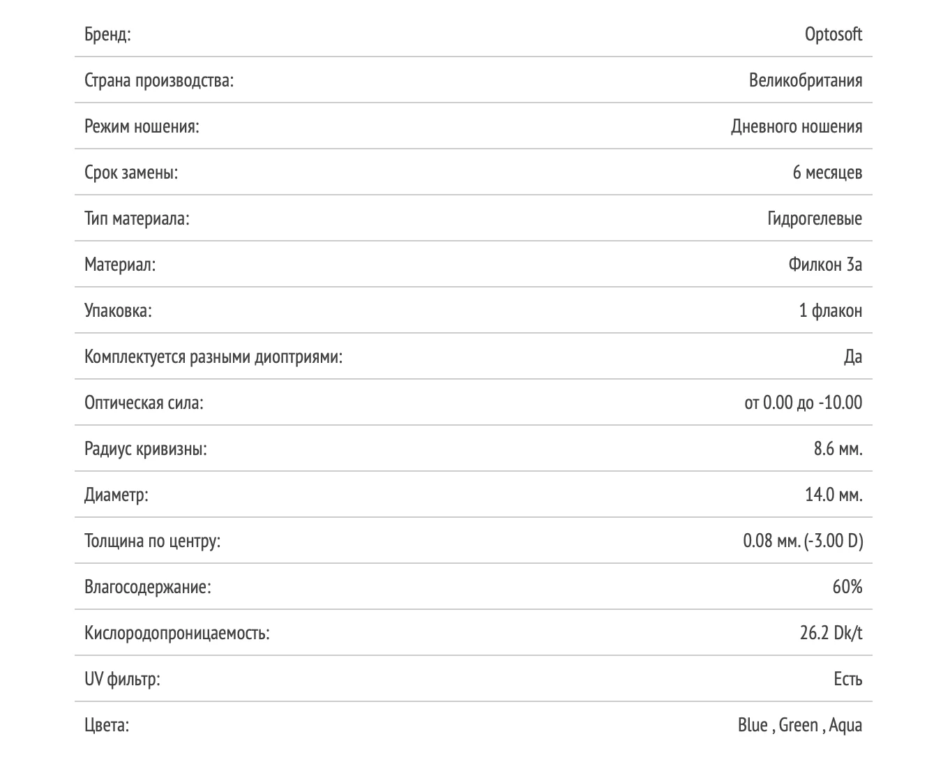 Оттеночные контактные линзы Optosoft (1 флакон) Одна линза.Линзы Optosoft усиливают натуральный цвет радужки, делая его насыщенным и ярким. Также по желанию пациент может выбрать вариант с диоптриями, поскольку эти оттеночные линзы корректируют близорукость разных степеней. Отличные оптические свойства материала с высоким коэффициентом влагосодержания в них (60%) делает эти офтальмологические изделия очень комфортными для ношения несмотря на длительный срок эксплуатации.Перед покупкой обязательно обратитесь к врачу-офтальмологу за консультацией.После покупки линз, вы должны помнить о необходимости ухаживать за ними. Для очистки изделия от микробов (от белковых и липидных отложений , профилактики инфицирования линз) необходимо использовать многофункциональные растворы. Подобные растворы вы с легкостью найдете на нашем сайте Линзынадом24.рф